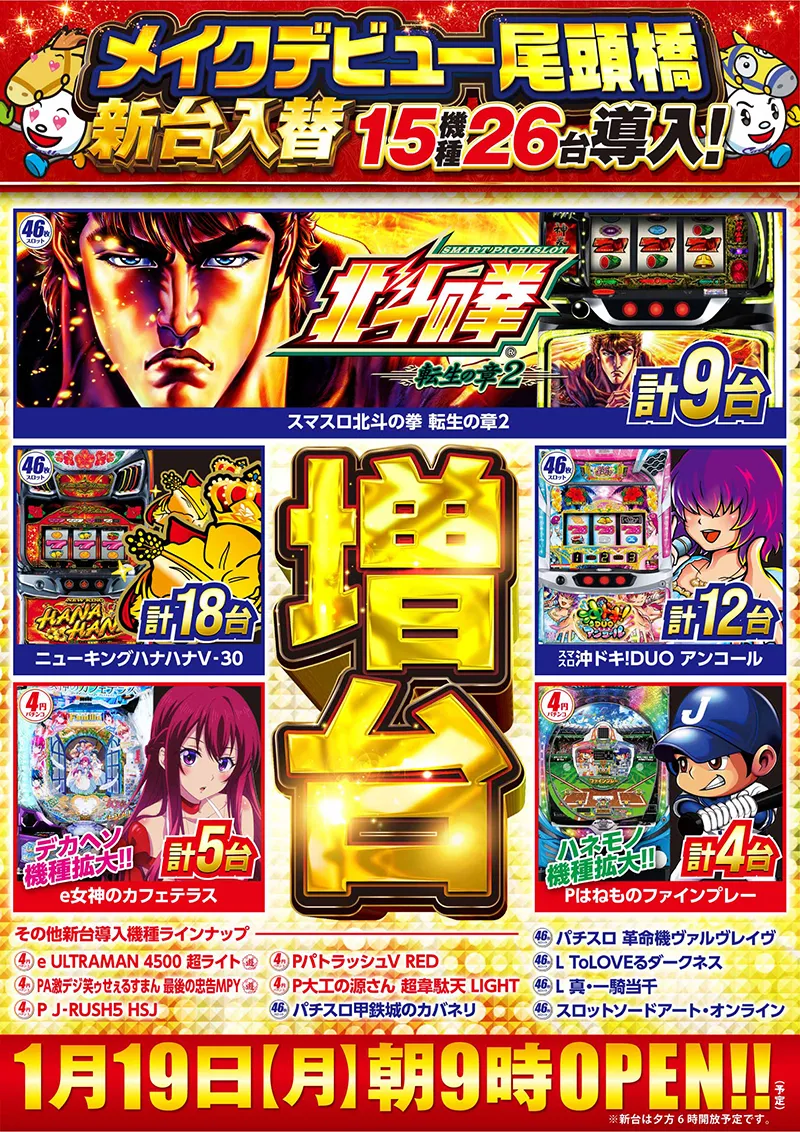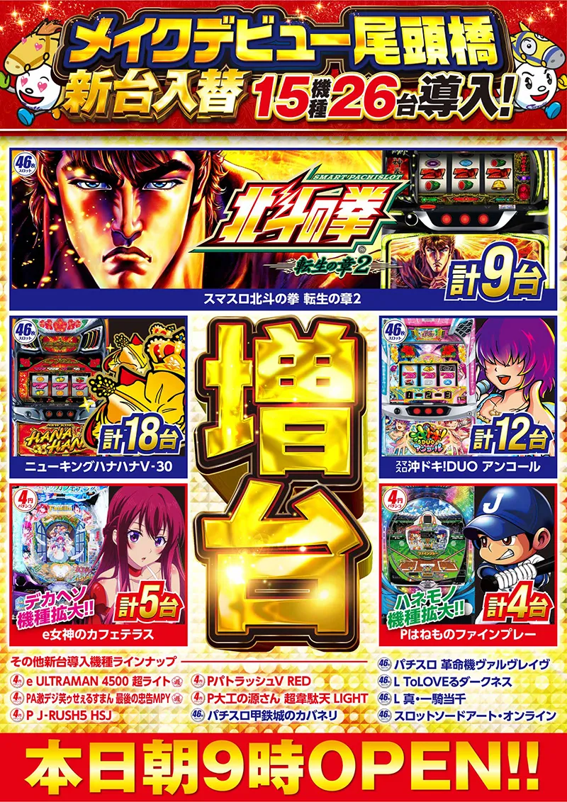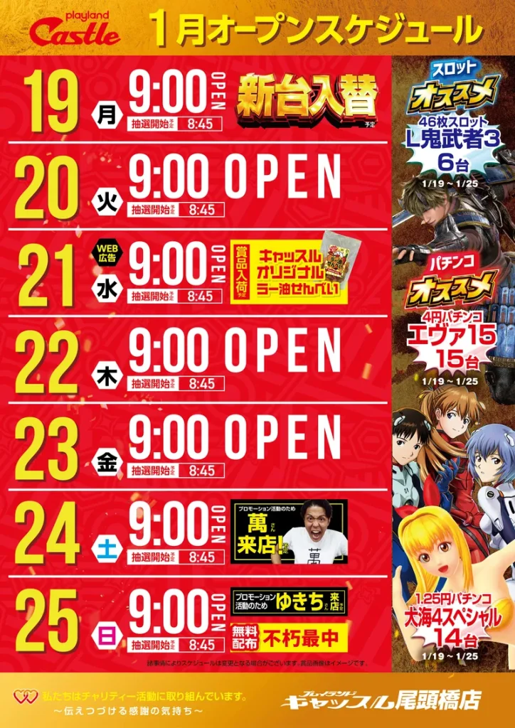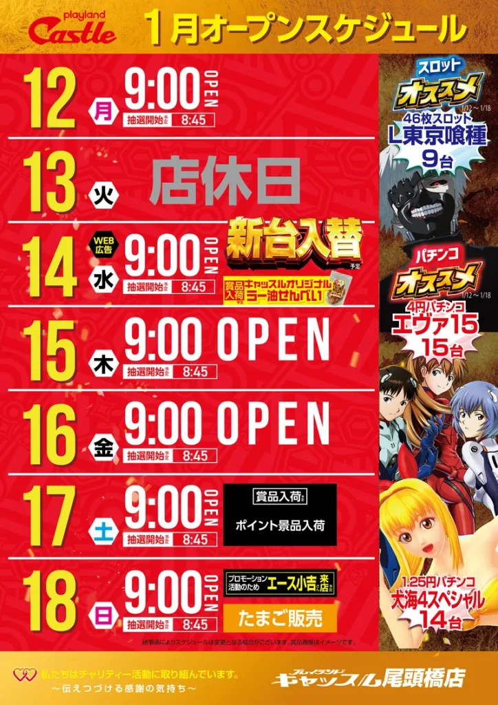 STORE INTRODUCTION 尾頭橋店 NEW MACHINE 新台入替のご案内 1月19日(月)朝9時オープン! 15機種26台 一挙導入(予定) SCHEDULE スケジュール キャッスルグループ全店1月21日水曜日朝9時オープン MENU 今月のメニュー 01 新台入替 これが最新導入機種だぁぁぁ! 02 オススメ機種 これが面白い!当店オススメはコレ! 03 機種ラインナップ 選べる楽しさ!設置機種情報はこちら! 04 ランキング&台データ 月間ランキングや当日データをチェック 05 入場方法 入場抽選時間や開店時間をチェック! 06 来店情報 有名人・インフルエンサー来店はこちら 07 厳選賞品・総付景品案内 厳選賞品や無料配布をGET! 08 ポイント景品入荷 ポイ活してゲット! 09 基本情報・アクセス Let′s Go! 10 設備・サービス 快適遊空間! 各店舗の最新情報やイメージキャラクター吉沢朱音の情報など盛り沢山でおとどけ! MENU メニュー 01 新台入替 02 オススメ機種 03 機種ラインナップ 04 ランキング&台データ 05 入場案内 06 来店情報 07 厳選賞品・総付景品案内 08 ポイント景品入荷 10 基本情報・アクセス 11 設備・サービス