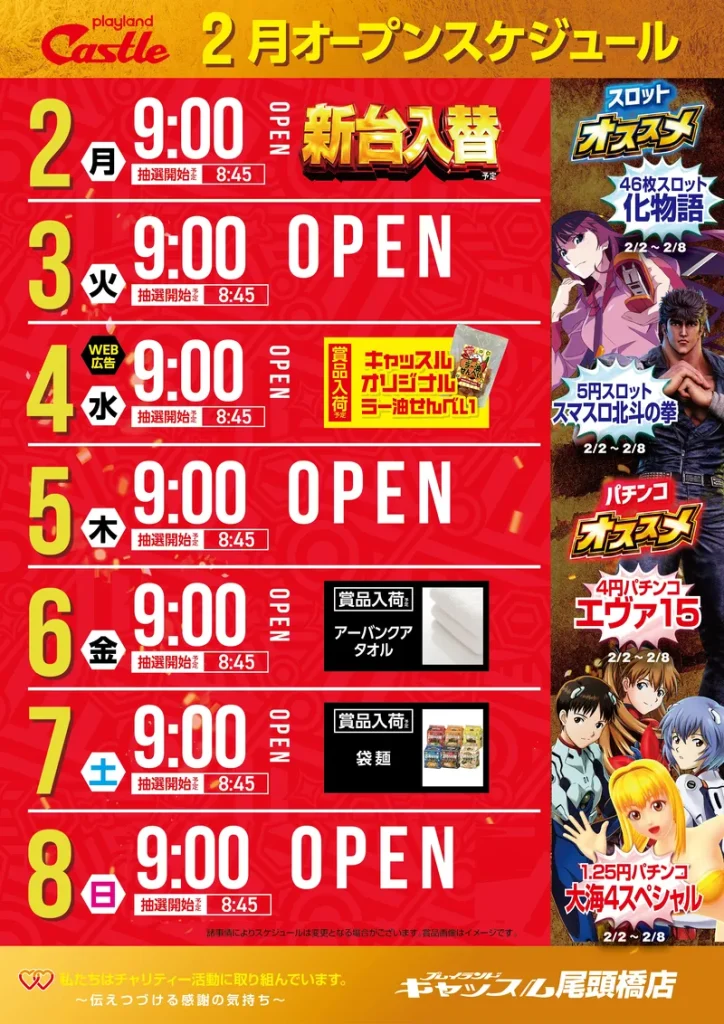 STORE INTRODUCTION 尾頭橋店 NEW MACHINE 新台入替のご案内 2月2日(月)朝9時オープン! 23機種46台 一挙導入(予定) SCHEDULE スケジュール キャッスルグループ全店2月4日水曜日朝9時オープン MENU 今月のメニュー 01 新台入替 これが最新導入機種だぁぁぁ! 02 オススメ機種 これが面白い!当店オススメはコレ! 03 機種ラインナップ 選べる楽しさ!設置機種情報はこちら! 04 ランキング&台データ 月間ランキングや当日データをチェック 05 入場方法 入場抽選時間や開店時間をチェック! 06 来店情報 有名人・インフルエンサー来店はこちら 07 厳選賞品・総付景品案内 厳選賞品や無料配布をGET! 08 ポイント景品入荷 ポイ活してゲット! 09 基本情報・アクセス Let′s Go! 10 設備・サービス 快適遊空間! 各店舗の最新情報やイメージキャラクター吉沢朱音の情報など盛り沢山でおとどけ! MENU メニュー 01 新台入替 02 オススメ機種 03 機種ラインナップ 04 ランキング&台データ 05 入場案内 06 来店情報 07 厳選賞品・総付景品案内 08 ポイント景品入荷 10 基本情報・アクセス 11 設備・サービス