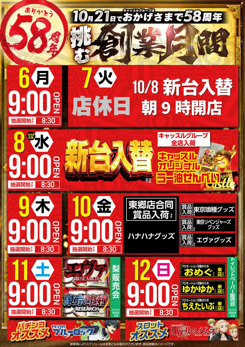 STORE INTRODUCTION 天白店 NEW MACHINE 新台入替のご案内 10月8日(水)朝9時オープン! 12機種115台 一挙導入 SCHEDULE スケジュール キャッスルグループ全店10月8日水曜日朝9時オープン MENU 今月のメニュー 01 新台入替 これが最新導入機種だぁぁぁ! 02 オススメ機種 これが面白い!当店オススメはコレ! 03 機種ラインナップ 選べる楽しさ!設置機種情報はこちら! 04 ランキング&台データ 月間ランキングや当日データをチェック 05 入場方法 入場抽選時間や開店時間をチェック! 06 来店情報 有名人・インフルエンサー来店はこちら 07 販売会・ポイント交換 販売会とポイ活でゲット! 08 厳選賞品・総付景品案内 厳選賞品や無料配布をGET! 09 基本情報・アクセス Let′s Go! 10 設備・サービス 快適遊空間! 各店舗の最新情報やイメージキャラクター吉沢朱音の情報など盛り沢山でおとどけ! MENU メニュー 01 新台入替 02 オススメ機種 03 機種ラインナップ 04 ランキング&台データ 05 入場案内 06 来店情報 07 販売会・ポイント交換 08 厳選賞品・総付景品案内 09 基本情報・アクセス 10 設備・サービス