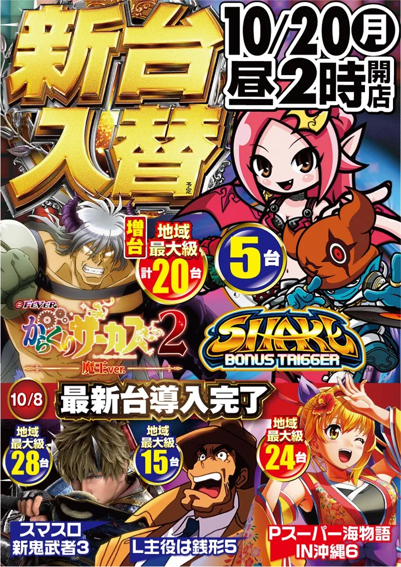 トップ_10/17 18:00 2025 10/17 STORE INTRODUCTION 天白店 NEW MACHINE 新台入替のご案内 10月20日(月)昼2時オープン! 16機種32台 一挙導入 SCHEDULE スケジュール キャッスルグループ全店10月22日水曜日朝9時オープン MENU 今月のメニュー 01 新台入替 これが最新導入機種だぁぁぁ! 02 オススメ機種 これが面白い!当店オススメはコレ! 03 機種ラインナップ 選べる楽しさ!設置機種情報はこちら! 04 ランキング&台データ 月間ランキングや当日データをチェック 05 入場方法 入場抽選時間や開店時間をチェック! 06 来店情報 有名人・インフルエンサー来店はこちら 07 販売会・ポイント交換 販売会とポイ活でゲット! 08 厳選賞品・総付景品案内 厳選賞品や無料配布をGET! 09 基本情報・アクセス Let′s Go! 10 設備・サービス 快適遊空間! 各店舗の最新情報やイメージキャラクター吉沢朱音の情報など盛り沢山でおとどけ! MENU メニュー 01 新台入替 02 オススメ機種 03 機種ラインナップ 04 ランキング&台データ 05 入場案内 06 来店情報 07 販売会・ポイント交換 08 厳選賞品・総付景品案内 09 基本情報・アクセス 10 設備・サービス