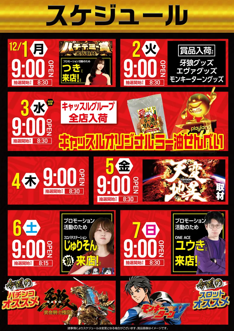 トップ_12/3 18:00 2025 12/03 STORE INTRODUCTION 天白店 NEW MACHINE 新台入替のご案内 11月19日(火)朝9時オープン! 18機種36台 一挙導入 SCHEDULE スケジュール キャッスルグループ全店12月10日水曜日朝9時オープン MENU 今月のメニュー 01 新台入替 これが最新導入機種だぁぁぁ! 02 オススメ機種 これが面白い!当店オススメはコレ! 03 機種ラインナップ 選べる楽しさ!設置機種情報はこちら! 04 ランキング&台データ 月間ランキングや当日データをチェック 05 入場方法 入場抽選時間や開店時間をチェック! 06 来店情報 有名人・インフルエンサー来店はこちら 07 販売会・ポイント交換 販売会とポイ活でゲット! 08 厳選賞品・総付景品案内 厳選賞品や無料配布をGET! 09 基本情報・アクセス Let′s Go! 10 設備・サービス 快適遊空間! 各店舗の最新情報やイメージキャラクター吉沢朱音の情報など盛り沢山でおとどけ! MENU メニュー 01 新台入替 02 オススメ機種 03 機種ラインナップ 04 ランキング&台データ 05 入場案内 06 来店情報 07 販売会・ポイント交換 08 厳選賞品・総付景品案内 09 基本情報・アクセス 10 設備・サービス
