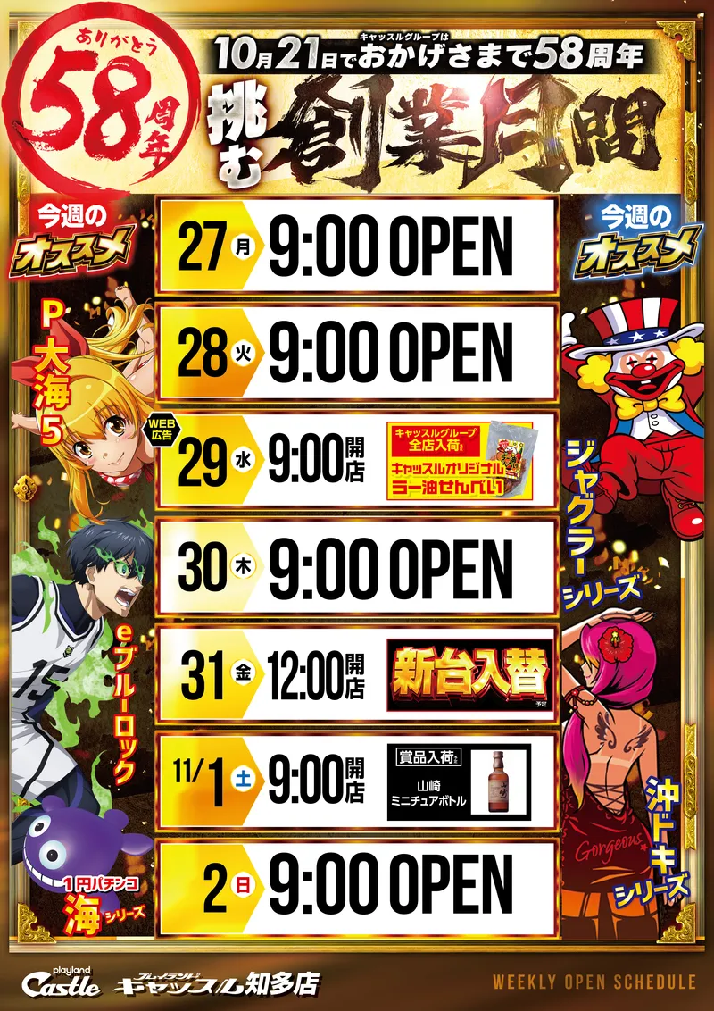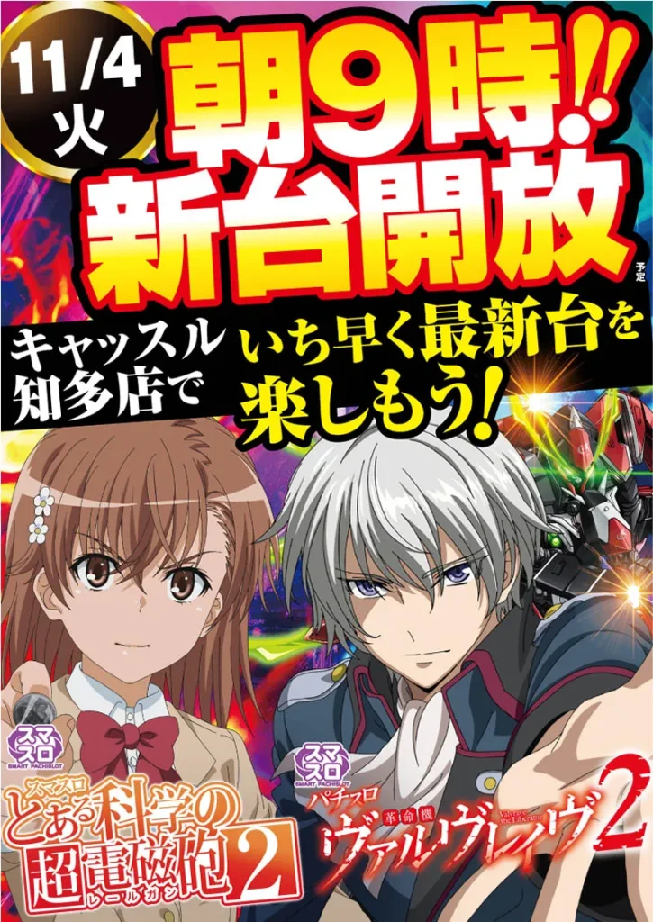 STORE INTRODUCTION 知多店 NEW MACHINE 新台入替のご案内 10月31日(金)昼12時オープン! 22機種34台 一挙導入 SCHEDULE 賞品入荷スケジュール キャッスルグループ全店11月5日水曜日朝9時オープン MENU 今月のメニュー 01 知多流とは 当店は”徹底”した営業を行っていきます! 02 新台入替 これが最新導入機種だぁぁぁ! 03 オススメ機種 これが面白い!当店オススメはコレ! 04 機種ラインナップ 選べる楽しさ!設置機種情報はこちら! 05 台データ 月間ランキングや当日データをチェック 06 入場案内 入場抽選時間や開店時間をチェック! 07 屋台 嬉しい!楽しい!催し物いっぱい 08 厳選賞品・総付景品案内 厳選賞品や無料配布をGET! 09 販売会・ポイント交換 嬉しい!楽しい!催し物いっぱい 10 基本情報・アクセス Let′s Go! 11 設備・サービス 快適遊空間! 各店舗の最新情報やイメージキャラクター吉沢朱音の情報など盛り沢山でおとどけ! MENU メニュー 01 知多流とは 02 新台入替 03 オススメ機種 04 機種ラインナップ 05 ランキング&台データ 06 入場案内 07 屋台 08 厳選賞品・総付景品案内 09 販売会・ポイント交換 10 基本情報・アクセス 11 設備・サービス