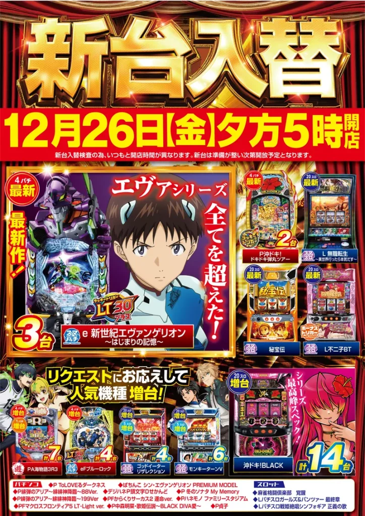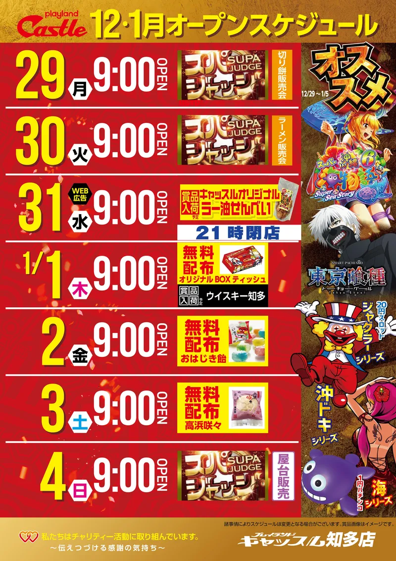 STORE INTRODUCTION 知多店 NEW MACHINE 新台入替のご案内 12月26日(金)夕方5時オープン! 25機種49台 一挙導入 SCHEDULE 賞品入荷スケジュール キャッスルグループ全店12月31日水曜日朝9時オープン MENU 今月のメニュー 01 知多流とは 当店は”徹底”した営業を行っていきます! 02 新台入替 これが最新導入機種だぁぁぁ! 03 オススメ機種 これが面白い!当店オススメはコレ! 04 機種ラインナップ 選べる楽しさ!設置機種情報はこちら! 05 台データ 月間ランキングや当日データをチェック 06 入場案内 入場抽選時間や開店時間をチェック! 07 屋台 嬉しい!楽しい!催し物いっぱい 08 厳選賞品・総付景品案内 厳選賞品や無料配布をGET! 09 販売会・ポイント交換 嬉しい!楽しい!催し物いっぱい 10 基本情報・アクセス Let′s Go! 11 設備・サービス 快適遊空間! 各店舗の最新情報やイメージキャラクター吉沢朱音の情報など盛り沢山でおとどけ! MENU メニュー 01 知多流とは 02 新台入替 03 オススメ機種 04 機種ラインナップ 05 ランキング&台データ 06 入場案内 07 屋台 08 厳選賞品・総付景品案内 09 販売会・ポイント交換 10 基本情報・アクセス 11 設備・サービス