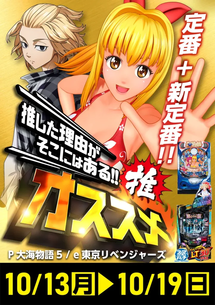 シリーズNo.1の天国期待値の『沖ドキ!GOLD』 基本的なゲームの流れはこれまでと共通で、告知が発生すればボーナス確定。天国以上のモードに移行していれば、32G以内にボーナスがループする。期待枚数は天国が約1300枚、ドキドキが約2000枚、超ドキドキが約2600枚と超強力だ。 新要素である「金ドキモード」は、次回天国モード以上が確定する特殊なモード。ループモード終了時にも滞在する可能性があるので、天国→金ドキ→ドキドキのように、切れ目のないループにも期待できる仕様となっている。 |