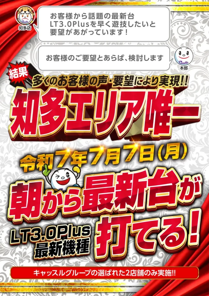 トップ_7/6 18:00 2025 7/06 NEW MACHINE 新台入替のご案内 7月4日(金)昼12時オープン! 32機種38台 一挙導入 SCHEDULE 賞品入荷スケジュール キャッスルグループ全店7月9日水曜日朝9時オープン MENU 今月のメニュー 01 知多流とは 当店は”徹底”した営業を行っていきます! 02 新台入替 これが最新導入機種だぁぁぁ! 03 オススメ機種 これが面白い!当店オススメはコレ! 04 機種ラインナップ 選べる楽しさ!設置機種情報はこちら! 05 台データ 月間ランキングや当日データをチェック 06 入場案内 入場抽選時間や開店時間をチェック! 07 屋台 嬉しい!楽しい!催し物いっぱい 08 厳選賞品・総付景品案内 厳選賞品や無料配布をGET! 08 販売会・ポイント交換 嬉しい!楽しい!催し物いっぱい 10 基本情報・アクセス Let′s Go! 11 設備・サービス 快適遊空間! 各店舗の最新情報やイメージキャラクター吉沢朱音の情報など盛り沢山でおとどけ! MENU メニュー 01 知多流とは 02 新台入替 03 オススメ機種 04 機種ラインナップ 05 ランキング&台データ 06 入場案内 07 屋台 08 厳選賞品・総付景品案内 09 販売会・ポイント交換 10 基本情報・アクセス 11 設備・サービス トップ