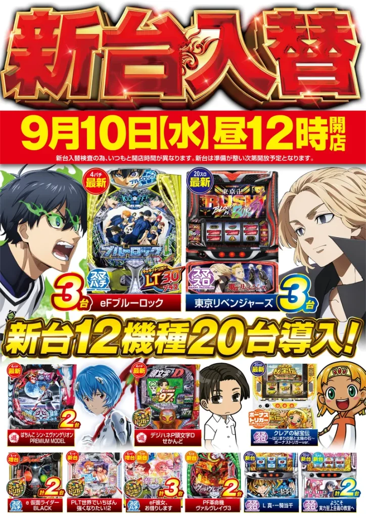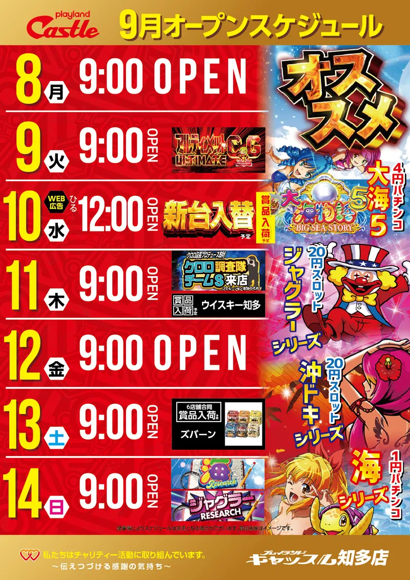 トップ_9/7 18:00 2025 9/07 STORE INTRODUCTION 知多店 NEW MACHINE 新台入替のご案内 9月10日(水)昼12時オープン! 12機種20台 一挙導入 SCHEDULE 賞品入荷スケジュール キャッスル知多店9月10日水曜日昼12時オープン MENU 今月のメニュー 01 知多流とは 当店は”徹底”した営業を行っていきます! 02 新台入替 これが最新導入機種だぁぁぁ! 03 オススメ機種 これが面白い!当店オススメはコレ! 04 機種ラインナップ 選べる楽しさ!設置機種情報はこちら! 05 台データ 月間ランキングや当日データをチェック 06 入場案内 入場抽選時間や開店時間をチェック! 07 屋台 嬉しい!楽しい!催し物いっぱい 08 厳選賞品・総付景品案内 厳選賞品や無料配布をGET! 09 販売会・ポイント交換 嬉しい!楽しい!催し物いっぱい 10 基本情報・アクセス Let′s Go! 11 設備・サービス 快適遊空間! 各店舗の最新情報やイメージキャラクター吉沢朱音の情報など盛り沢山でおとどけ! MENU メニュー 01 知多流とは 02 新台入替 03 オススメ機種 04 機種ラインナップ 05 ランキング&台データ 06 入場案内 07 屋台 08 厳選賞品・総付景品案内 09 販売会・ポイント交換 10 基本情報・アクセス 11 設備・サービス トップ