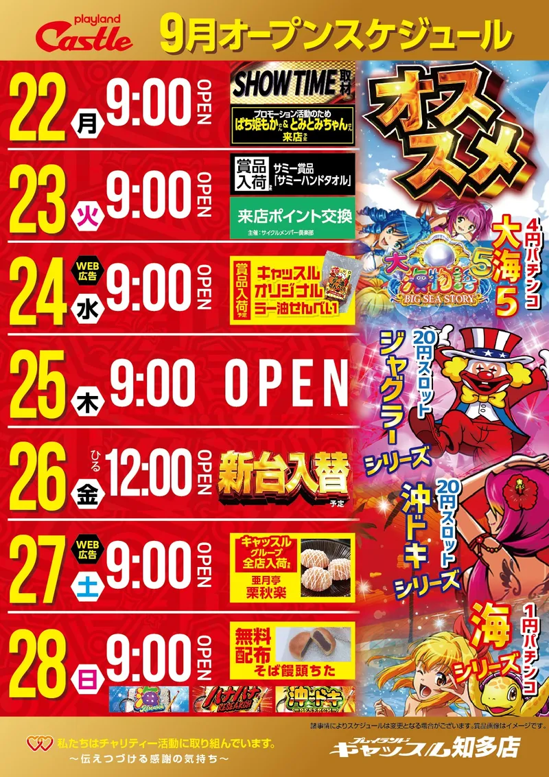 トップ_9/21 18:00 2025 9/21 STORE INTRODUCTION 知多店 NEW MACHINE 新台入替のご案内 9月26日(金)昼12時オープン! 14機種18台 一挙導入 SCHEDULE 賞品入荷スケジュール キャッスルグループ全店9月24日水曜日朝9時オープン MENU 今月のメニュー 01 知多流とは 当店は”徹底”した営業を行っていきます! 02 新台入替 これが最新導入機種だぁぁぁ! 03 オススメ機種 これが面白い!当店オススメはコレ! 04 機種ラインナップ 選べる楽しさ!設置機種情報はこちら! 05 台データ 月間ランキングや当日データをチェック 06 入場案内 入場抽選時間や開店時間をチェック! 07 屋台 嬉しい!楽しい!催し物いっぱい 08 厳選賞品・総付景品案内 厳選賞品や無料配布をGET! 09 販売会・ポイント交換 嬉しい!楽しい!催し物いっぱい 10 基本情報・アクセス Let′s Go! 11 設備・サービス 快適遊空間! 各店舗の最新情報やイメージキャラクター吉沢朱音の情報など盛り沢山でおとどけ! MENU メニュー 01 知多流とは 02 新台入替 03 オススメ機種 04 機種ラインナップ 05 ランキング&台データ 06 入場案内 07 屋台 08 厳選賞品・総付景品案内 09 販売会・ポイント交換 10 基本情報・アクセス 11 設備・サービス トップ