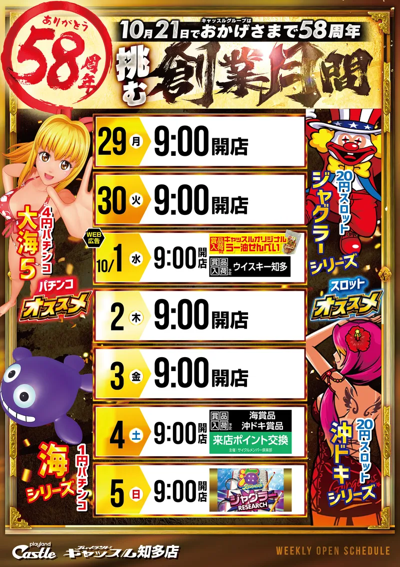 トップ_10/3 18:00 2025 10/03 STORE INTRODUCTION 知多店 NEW MACHINE 新台入替のご案内 10月8日(水)朝9時オープン! 20機種43台 一挙導入 SCHEDULE 賞品入荷スケジュール キャッスルグループ全店10月8日水曜日朝9時オープン MENU 今月のメニュー 01 知多流とは 当店は”徹底”した営業を行っていきます! 02 新台入替 これが最新導入機種だぁぁぁ! 03 オススメ機種 これが面白い!当店オススメはコレ! 04 機種ラインナップ 選べる楽しさ!設置機種情報はこちら! 05 台データ 月間ランキングや当日データをチェック 06 入場案内 入場抽選時間や開店時間をチェック! 07 屋台 嬉しい!楽しい!催し物いっぱい 08 厳選賞品・総付景品案内 厳選賞品や無料配布をGET! 09 販売会・ポイント交換 嬉しい!楽しい!催し物いっぱい 10 基本情報・アクセス Let′s Go! 11 設備・サービス 快適遊空間! 各店舗の最新情報やイメージキャラクター吉沢朱音の情報など盛り沢山でおとどけ! MENU メニュー 01 知多流とは 02 新台入替 03 オススメ機種 04 機種ラインナップ 05 ランキング&台データ 06 入場案内 07 屋台 08 厳選賞品・総付景品案内 09 販売会・ポイント交換 10 基本情報・アクセス 11 設備・サービス トップ