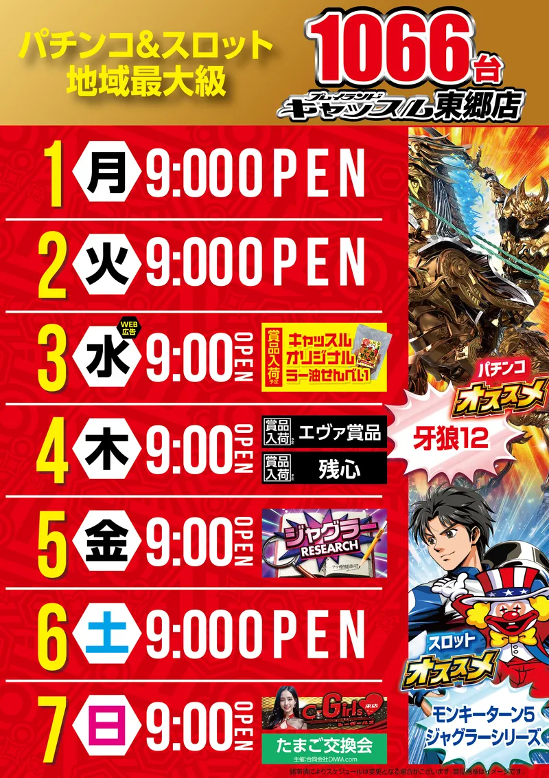 STORE INTRODUCTION 東郷店 NEW MACHINE 新台入替のご案内 11月17日(月)朝9時オープン! 8機種19台導入 SCHEDULE スケジュール キャッスルグループ全店12月10日水曜日朝9時オープン MENU 今月のメニュー 01 新台入替 これが最新導入機種だぁぁぁ! 02 オススメ機種 これが面白い!当店オススメはコレ! 03 機種ラインナップ 選べる楽しさ!設置機種情報はこちら! 04 台データ 当日データをチェック 05 入場方法 入場抽選時間や開店時間をチェック! 06 来店情報 有名人・インフルエンサー来店はこちら 07 厳選賞品・総付景品案内 厳選賞品や無料配布をGET! 08 基本情報・アクセス Let′s Go! 09 設備・サービス 快適遊空間! 各店舗の最新情報やイメージキャラクター吉沢朱音の情報など盛り沢山でおとどけ! MENU メニュー 01 新台入替 02 オススメ機種 03 機種ラインナップ 04 台データ 05 入場案内 06 来店情報 07 厳選賞品・総付景品案内 08 基本情報・アクセス 09 設備・サービス