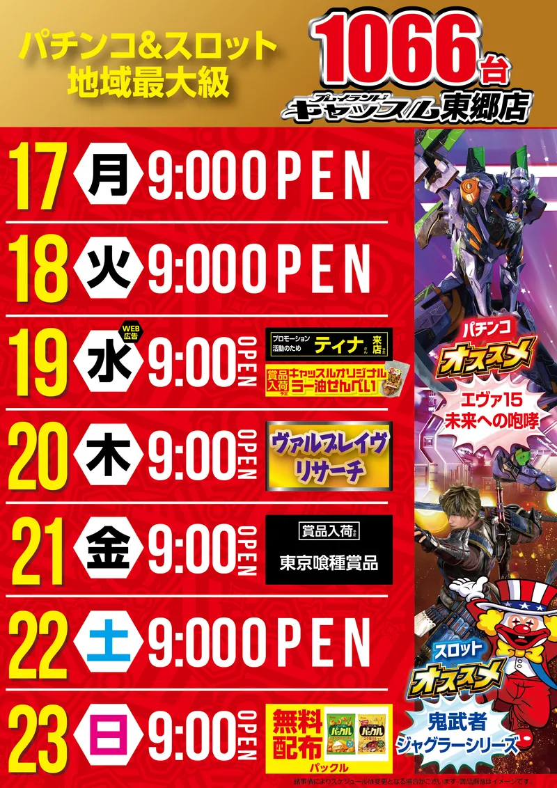 STORE INTRODUCTION 東郷店 NEW MACHINE 新台入替のご案内 11月17日(月)朝9時オープン! 8機種19台導入 SCHEDULE スケジュール キャッスルグループ全店11月26日水曜日朝9時オープン MENU 今月のメニュー 01 新台入替 これが最新導入機種だぁぁぁ! 02 オススメ機種 これが面白い!当店オススメはコレ! 03 機種ラインナップ 選べる楽しさ!設置機種情報はこちら! 04 台データ 当日データをチェック 05 入場方法 入場抽選時間や開店時間をチェック! 06 来店情報 有名人・インフルエンサー来店はこちら 07 厳選賞品・総付景品案内 厳選賞品や無料配布をGET! 08 基本情報・アクセス Let′s Go! 09 設備・サービス 快適遊空間! 各店舗の最新情報やイメージキャラクター吉沢朱音の情報など盛り沢山でおとどけ! MENU メニュー 01 新台入替 02 オススメ機種 03 機種ラインナップ 04 台データ 05 入場案内 06 来店情報 07 厳選賞品・総付景品案内 08 基本情報・アクセス 09 設備・サービス