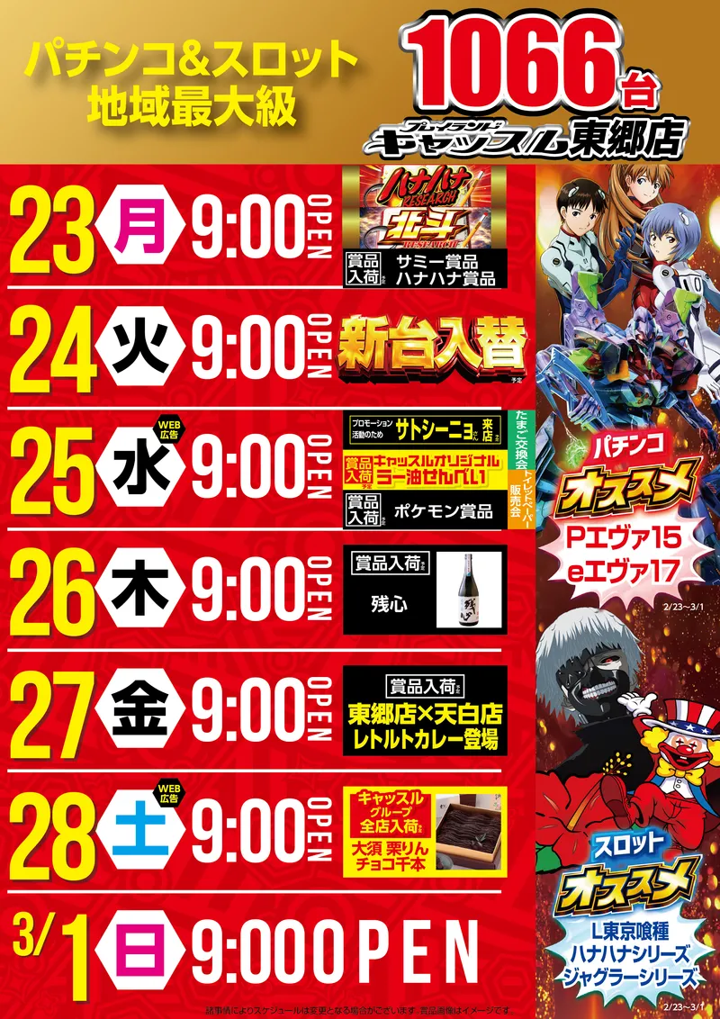 NEW MACHINE 新台入替のご案内 2月24日(火)朝9時オープン! 10機種18台導入(予定) SCHEDULE スケジュール キャッスルグループ全店2月25日水曜日朝9時オープン MENU 今月のメニュー 01 新台入替 これが最新導入機種だぁぁぁ! 02 オススメ機種 これが面白い!当店オススメはコレ! 03 機種ラインナップ 選べる楽しさ!設置機種情報はこちら! 04 台データ 当日データをチェック 05 入場方法 入場抽選時間や開店時間をチェック! 06 来店情報 有名人・インフルエンサー来店はこちら 07 厳選賞品・総付景品案内 厳選賞品や無料配布をGET! 08 基本情報・アクセス Let′s Go! 09 設備・サービス 快適遊空間! 各店舗の最新情報やイメージキャラクター吉沢朱音の情報など盛り沢山でおとどけ! MENU メニュー 01 新台入替 02 オススメ機種 03 機種ラインナップ 04 台データ 05 入場案内 06 来店情報 07 厳選賞品・総付景品案内 08 基本情報・アクセス 09 設備・サービス
