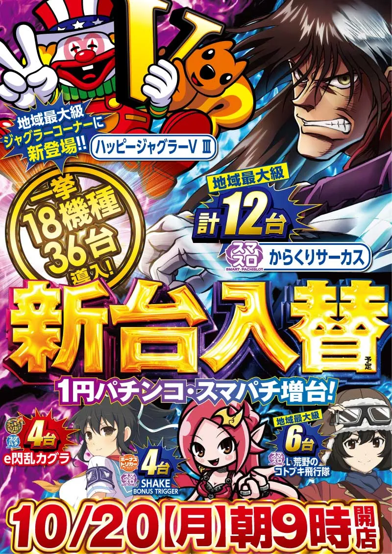 トップ_10/17 18:00 2025 10/17 STORE INTRODUCTION 東郷店 NEW MACHINE 新台入替のご案内 10月20日(月)朝9時オープン! 18機種36台導入 SCHEDULE スケジュール キャッスルグループ全店10月22日水曜日朝9時オープン MENU 今月のメニュー 01 新台入替 これが最新導入機種だぁぁぁ! 02 オススメ機種 これが面白い!当店オススメはコレ! 03 機種ラインナップ 選べる楽しさ!設置機種情報はこちら! 04 台データ 当日データをチェック 05 入場方法 入場抽選時間や開店時間をチェック! 06 来店情報 有名人・インフルエンサー来店はこちら 07 厳選賞品・総付景品案内 厳選賞品や無料配布をGET! 08 基本情報・アクセス Let′s Go! 09 設備・サービス 快適遊空間! 各店舗の最新情報やイメージキャラクター吉沢朱音の情報など盛り沢山でおとどけ! MENU メニュー 01 新台入替 02 オススメ機種 03 機種ラインナップ 04 台データ 05 入場案内 06 来店情報 07 厳選賞品・総付景品案内 08 基本情報・アクセス 09 設備・サービス トップ