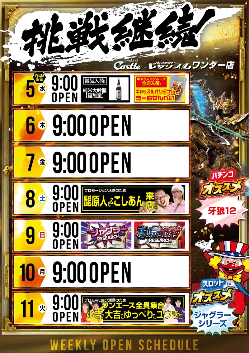 STORE INTRODUCTION ワンダー店 NEW MACHINE 新台入替のご案内 11月4日(火)昼1時オープン! 15機種72台 一挙導入 SCHEDULE スケジュール キャッスルグループ全店11月5日水曜日朝9時オープン MENU 今月のメニュー 01 新台入替 これが最新導入機種だぁぁぁ! 02 オススメ機種 これが面白い!当店オススメはコレ! 03 機種ラインナップ 選べる楽しさ!設置機種情報はこちら! 04 ランキング&台データ 月間ランキングや当日データをチェック 05 入場方法 入場抽選時間や開店時間をチェック! 06 来店情報 有名人・インフルエンサー来店はこちら 07 厳選賞品・総付景品案内 厳選賞品や無料配布をGET! 08 屋台 嬉しい!楽しい!催し物いっぱい 09 基本情報・アクセス Let′s Go! 10 設備・サービス 快適遊空間! 各店舗の最新情報やイメージキャラクター吉沢朱音の情報など盛り沢山でおとどけ! MENU メニュー 01 新台入替 02 オススメ機種 03 機種ラインナップ 04 ランキング&台データ 05 入場案内 06 来店情報 07 厳選賞品・総付景品案内 08 屋台 09 基本情報・アクセス 10 設備・サービス