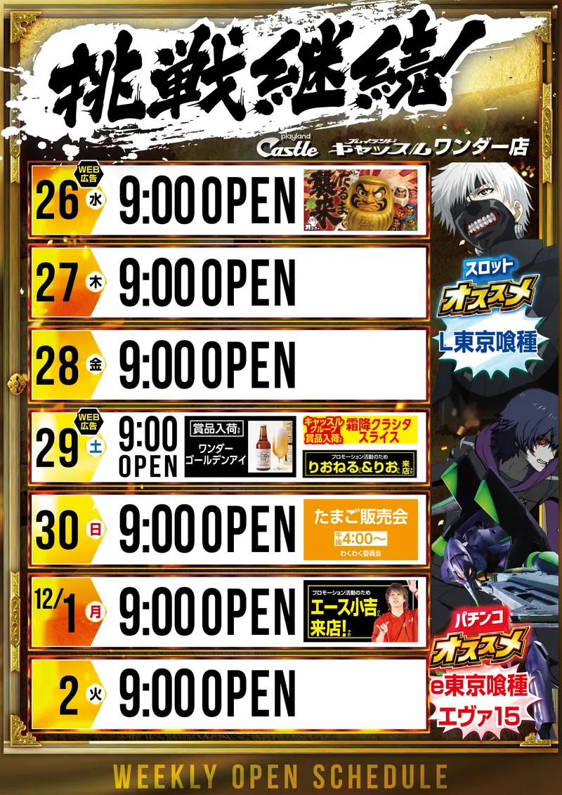 STORE INTRODUCTION ワンダー店 NEW MACHINE 新台入替のご案内 11月17日(月)昼1時オープン! 9機種31台 一挙導入 SCHEDULE スケジュール キャッスルグループ全店11月26日水曜日朝9時オープン MENU 今月のメニュー 01 新台入替 これが最新導入機種だぁぁぁ! 02 オススメ機種 これが面白い!当店オススメはコレ! 03 機種ラインナップ 選べる楽しさ!設置機種情報はこちら! 04 ランキング&台データ 月間ランキングや当日データをチェック 05 入場方法 入場抽選時間や開店時間をチェック! 06 来店情報 有名人・インフルエンサー来店はこちら 07 厳選賞品・総付景品案内 厳選賞品や無料配布をGET! 08 屋台 嬉しい!楽しい!催し物いっぱい 09 基本情報・アクセス Let′s Go! 10 設備・サービス 快適遊空間! 各店舗の最新情報やイメージキャラクター吉沢朱音の情報など盛り沢山でおとどけ! MENU メニュー 01 新台入替 02 オススメ機種 03 機種ラインナップ 04 ランキング&台データ 05 入場案内 06 来店情報 07 厳選賞品・総付景品案内 08 屋台 09 基本情報・アクセス 10 設備・サービス