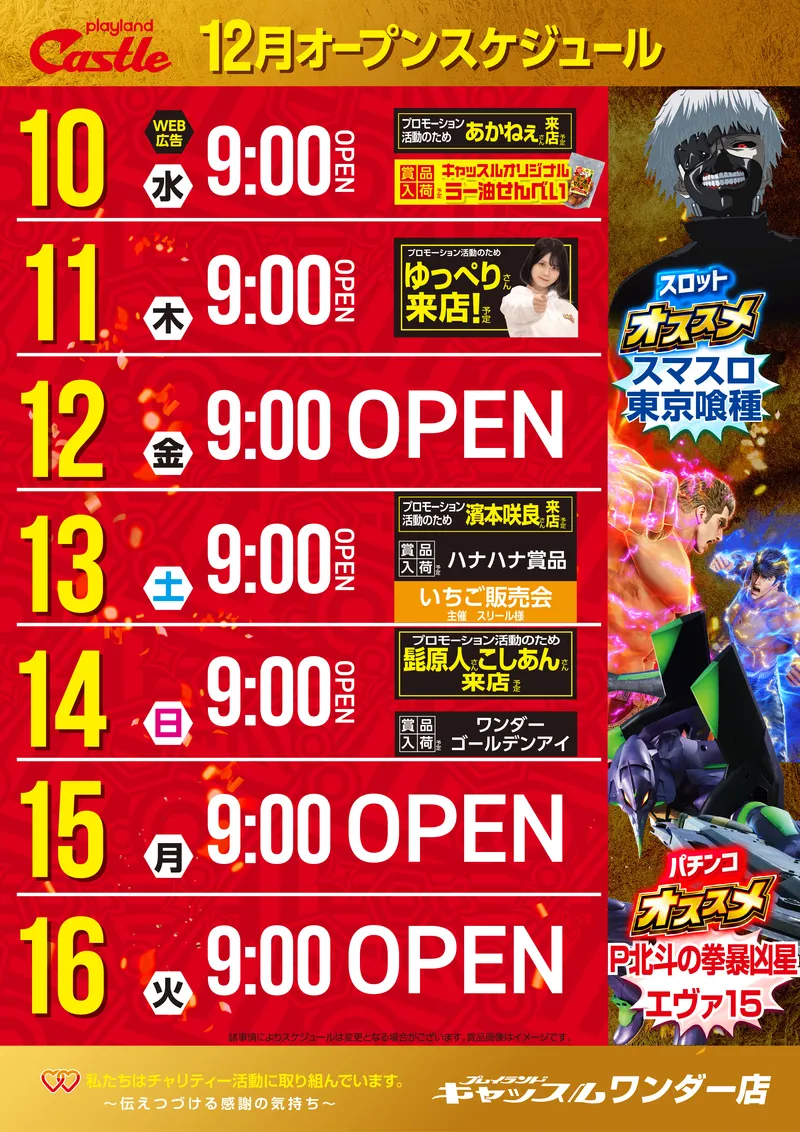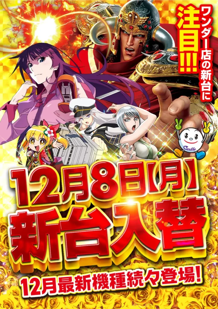STORE INTRODUCTION ワンダー店 NEW MACHINE 新台入替のご案内 12月8日(月)昼1時オープン! 9機種48台 一挙導入 SCHEDULE スケジュール キャッスルグループ全店12月17日水曜日朝9時オープン MENU 今月のメニュー 01 新台入替 これが最新導入機種だぁぁぁ! 02 オススメ機種 これが面白い!当店オススメはコレ! 03 機種ラインナップ 選べる楽しさ!設置機種情報はこちら! 04 ランキング&台データ 月間ランキングや当日データをチェック 05 入場方法 入場抽選時間や開店時間をチェック! 06 来店情報 有名人・インフルエンサー来店はこちら 07 厳選賞品・総付景品案内 厳選賞品や無料配布をGET! 08 屋台 嬉しい!楽しい!催し物いっぱい 09 基本情報・アクセス Let′s Go! 10 設備・サービス 快適遊空間! 各店舗の最新情報やイメージキャラクター吉沢朱音の情報など盛り沢山でおとどけ! MENU メニュー 01 新台入替 02 オススメ機種 03 機種ラインナップ 04 ランキング&台データ 05 入場案内 06 来店情報 07 厳選賞品・総付景品案内 08 屋台 09 基本情報・アクセス 10 設備・サービス