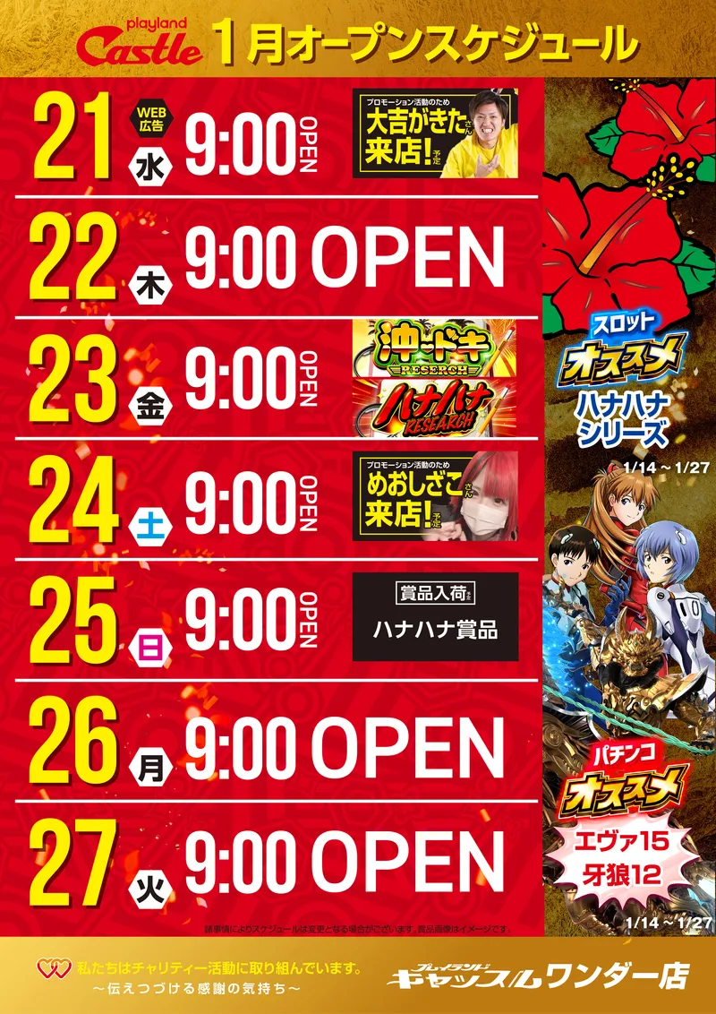 STORE INTRODUCTION ワンダー店 NEW MACHINE 新台入替のご案内 1月19日(月)13時オープン! 23機種34台 一挙導入 SCHEDULE スケジュール キャッスルグループ全店1月28日水曜日朝9時オープン MENU 今月のメニュー 01 新台入替 これが最新導入機種だぁぁぁ! 02 オススメ機種 これが面白い!当店オススメはコレ! 03 機種ラインナップ 選べる楽しさ!設置機種情報はこちら! 04 ランキング&台データ 月間ランキングや当日データをチェック 05 入場方法 入場抽選時間や開店時間をチェック! 06 来店情報 有名人・インフルエンサー来店はこちら 07 厳選賞品・総付景品案内 厳選賞品や無料配布をGET! 08 屋台 嬉しい!楽しい!催し物いっぱい 09 基本情報・アクセス Let′s Go! 10 設備・サービス 快適遊空間! 各店舗の最新情報やイメージキャラクター吉沢朱音の情報など盛り沢山でおとどけ! MENU メニュー 01 新台入替 02 オススメ機種 03 機種ラインナップ 04 ランキング&台データ 05 入場案内 06 来店情報 07 厳選賞品・総付景品案内 08 屋台 09 基本情報・アクセス 10 設備・サービス