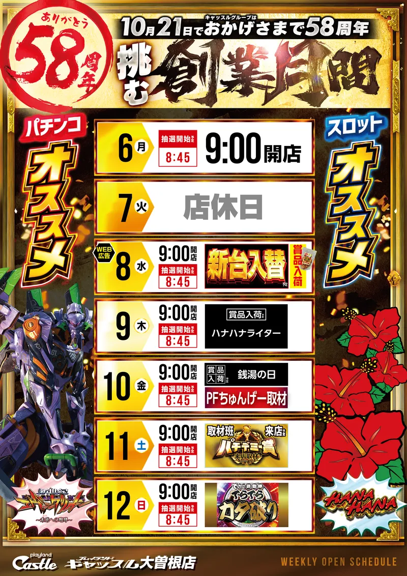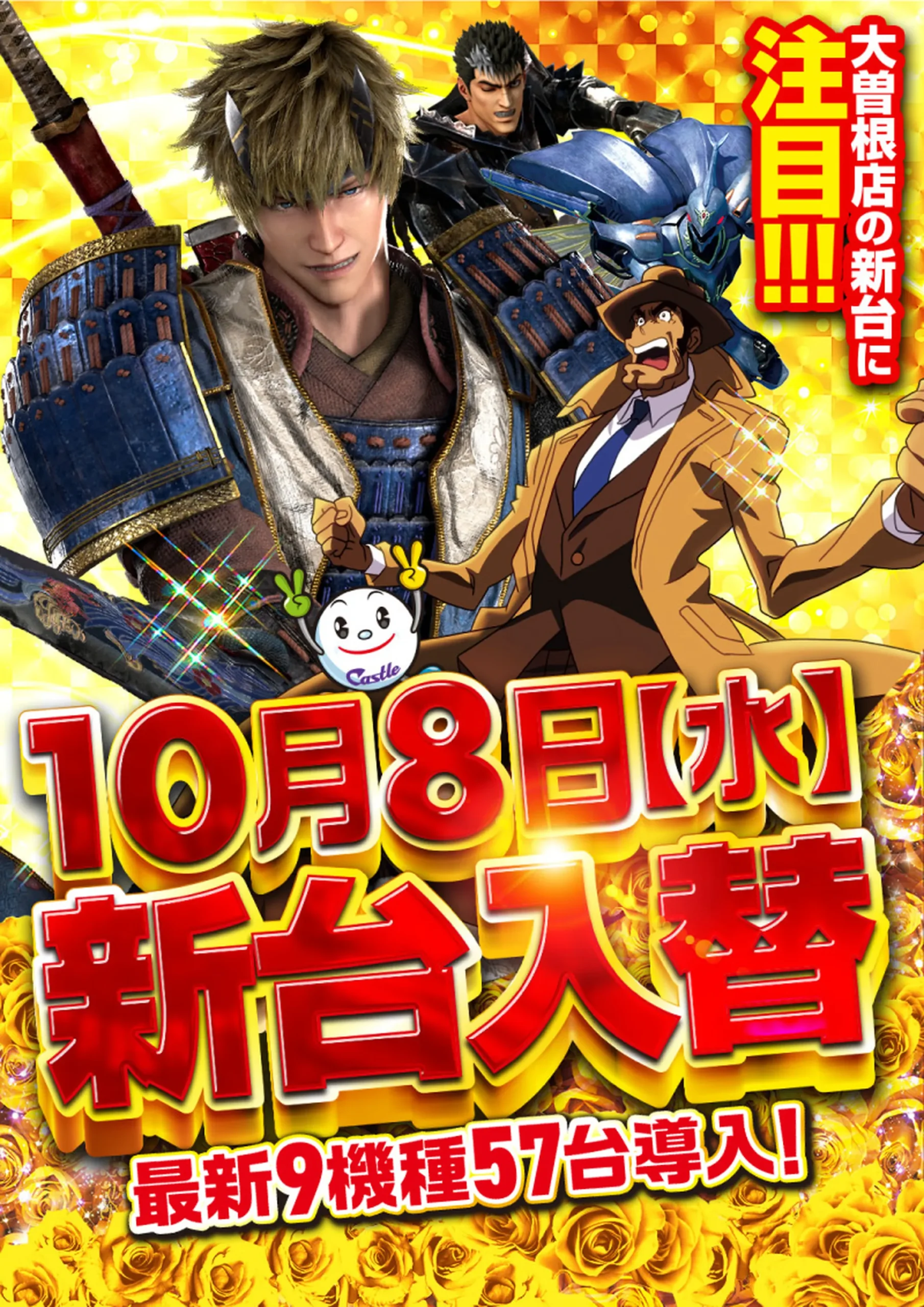 STORE INTRODUCTION 大曽根店 NEW MACHINE 新台入替のご案内 10月8日(月)朝9時オープン! 11機種74台一挙導入 SCHEDULE スケジュール キャッスルグループ全店10月8日水曜日朝9時オープン MENU 今月のメニュー 01 新台入替 これが最新導入機種だぁぁぁ! 02 オススメ機種 これが面白い!当店オススメはコレ! 03 機種ラインナップ 選べる楽しさ!設置機種情報はこちら! 04 ランキング&台データ 月間ランキングや当日データをチェック 05 入場方法 入場抽選時間や開店時間をチェック! 06 来店情報 有名人・インフルエンサー来店はこちら 07 厳選賞品・総付景品案内 厳選賞品や無料配布をGET! 08 ポイント景品入荷 ポイ活してゲット! 09 販売会・屋台 嬉しい!楽しい!催し物いっぱい 10 基本情報・アクセス Let′s Go! 11 設備・サービス 快適遊空間! 遊技の後は大曽根温泉湯の城で決まり 各店舗の最新情報やイメージキャラクター吉沢朱音の情報など盛り沢山でおとどけ! MENU メニュー 01 新台入替 02 オススメ機種 03 機種ラインナップ 04 ランキング&台データ 05 入場案内 06 来店情報 07 厳選賞品・総付景品案内 08 ポイント景品入荷 09 販売会・屋台 10 基本情報・アクセス 11 設備・サービス