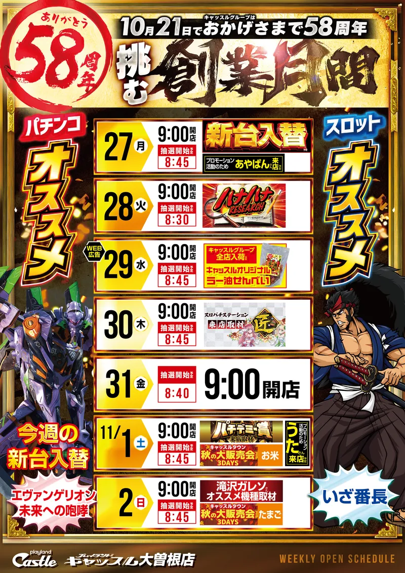 STORE INTRODUCTION 大曽根店 NEW MACHINE 新台入替のご案内 10月24日(金)朝9時オープン! 3機種15台一挙導入 SCHEDULE スケジュール キャッスルグループ全店10月29日水曜日朝9時オープン MENU 今月のメニュー 01 新台入替 これが最新導入機種だぁぁぁ! 02 オススメ機種 これが面白い!当店オススメはコレ! 03 機種ラインナップ 選べる楽しさ!設置機種情報はこちら! 04 ランキング&台データ 月間ランキングや当日データをチェック 05 入場方法 入場抽選時間や開店時間をチェック! 06 来店情報 有名人・インフルエンサー来店はこちら 07 厳選賞品・総付景品案内 厳選賞品や無料配布をGET! 08 ポイント景品入荷 ポイ活してゲット! 09 販売会・屋台 嬉しい!楽しい!催し物いっぱい 10 基本情報・アクセス Let′s Go! 11 設備・サービス 快適遊空間! 遊技の後は大曽根温泉湯の城で決まり 各店舗の最新情報やイメージキャラクター吉沢朱音の情報など盛り沢山でおとどけ! MENU メニュー 01 新台入替 02 オススメ機種 03 機種ラインナップ 04 ランキング&台データ 05 入場案内 06 来店情報 07 厳選賞品・総付景品案内 08 ポイント景品入荷 09 販売会・屋台 10 基本情報・アクセス 11 設備・サービス