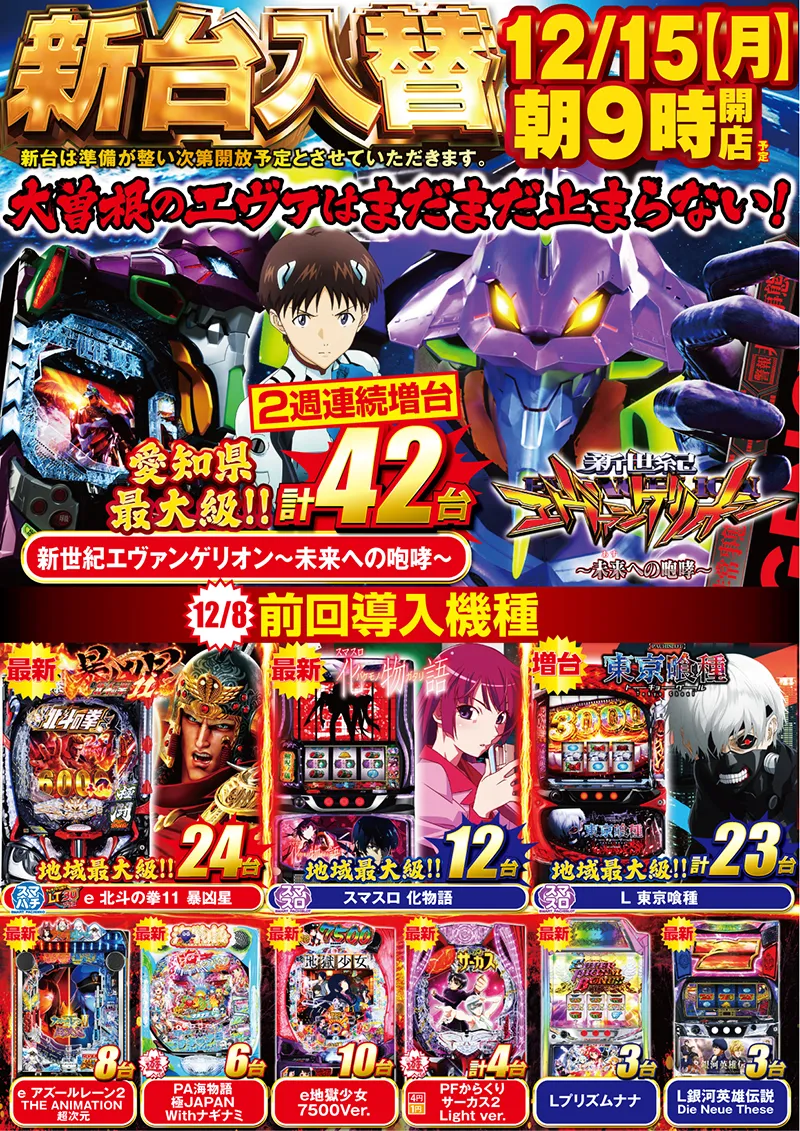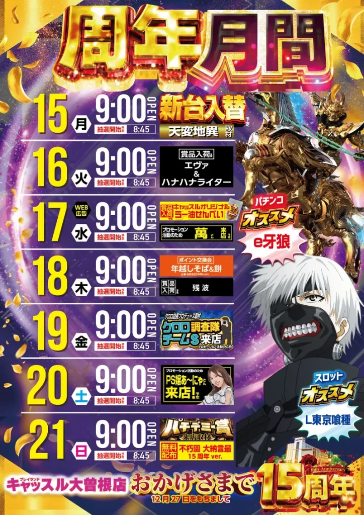 STORE INTRODUCTION 大曽根店 NEW MACHINE 新台入替のご案内 12月15日(月)朝9時オープン! 5機種13台一挙導入 SCHEDULE スケジュール キャッスルグループ全店12月24日水曜日朝9時オープン MENU 今月のメニュー 01 新台入替 これが最新導入機種だぁぁぁ! 02 オススメ機種 これが面白い!当店オススメはコレ! 03 機種ラインナップ 選べる楽しさ!設置機種情報はこちら! 04 ランキング&台データ 月間ランキングや当日データをチェック 05 入場方法 入場抽選時間や開店時間をチェック! 06 来店情報 有名人・インフルエンサー来店はこちら 07 厳選賞品・総付景品案内 厳選賞品や無料配布をGET! 08 ポイント景品入荷 ポイ活してゲット! 09 販売会・屋台 嬉しい!楽しい!催し物いっぱい 10 基本情報・アクセス Let′s Go! 11 設備・サービス 快適遊空間! 遊技の後は大曽根温泉湯の城で決まり 各店舗の最新情報やイメージキャラクター吉沢朱音の情報など盛り沢山でおとどけ! MENU メニュー 01 新台入替 02 オススメ機種 03 機種ラインナップ 04 ランキング&台データ 05 入場案内 06 来店情報 07 厳選賞品・総付景品案内 08 ポイント景品入荷 09 販売会・屋台 10 基本情報・アクセス 11 設備・サービス