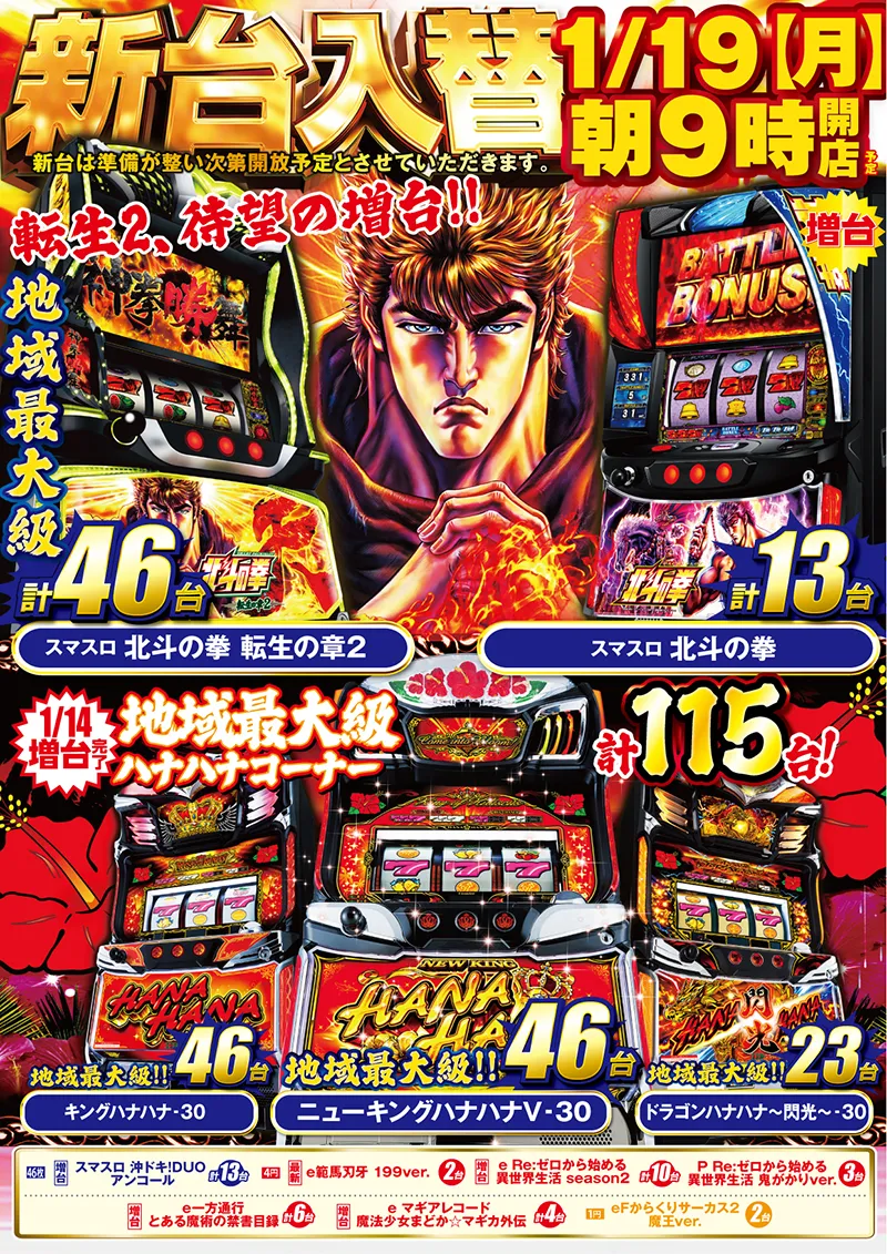 NEW MACHINE 新台入替のご案内 1月19日(月)朝9時オープン! 8機種41台一挙導入(予定) SCHEDULE スケジュール キャッスルグループ全店1月21日水曜日朝9時オープン MENU 今月のメニュー 01 新台入替 これが最新導入機種だぁぁぁ! 02 オススメ機種 これが面白い!当店オススメはコレ! 03 機種ラインナップ 選べる楽しさ!設置機種情報はこちら! 04 ランキング&台データ 月間ランキングや当日データをチェック 05 入場方法 入場抽選時間や開店時間をチェック! 06 来店情報 有名人・インフルエンサー来店はこちら 07 厳選賞品・総付景品案内 厳選賞品や無料配布をGET! 08 ポイント景品入荷 ポイ活してゲット! 09 販売会・屋台 嬉しい!楽しい!催し物いっぱい 10 基本情報・アクセス Let′s Go! 11 設備・サービス 快適遊空間! 遊技の後は大曽根温泉湯の城で決まり 各店舗の最新情報やイメージキャラクター吉沢朱音の情報など盛り沢山でおとどけ! MENU メニュー 01 新台入替 02 オススメ機種 03 機種ラインナップ 04 ランキング&台データ 05 入場案内 06 来店情報 07 厳選賞品・総付景品案内 08 ポイント景品入荷 09 販売会・屋台 10 基本情報・アクセス 11 設備・サービス