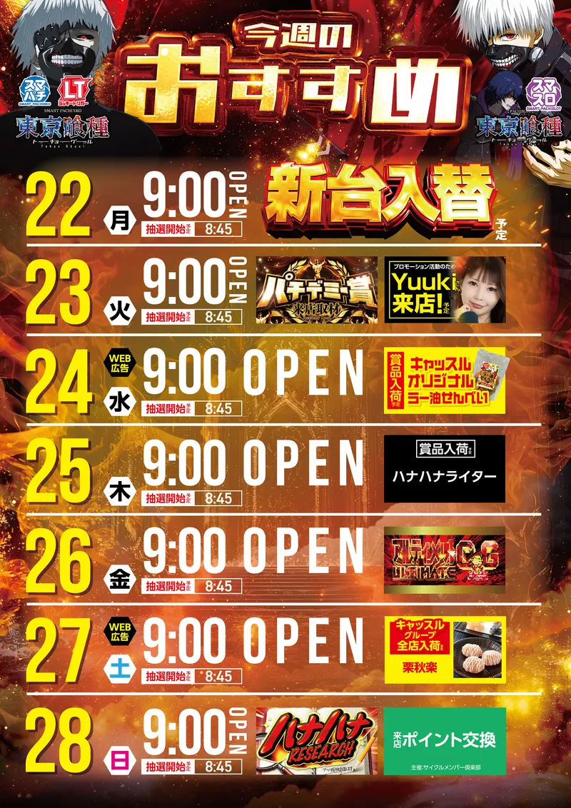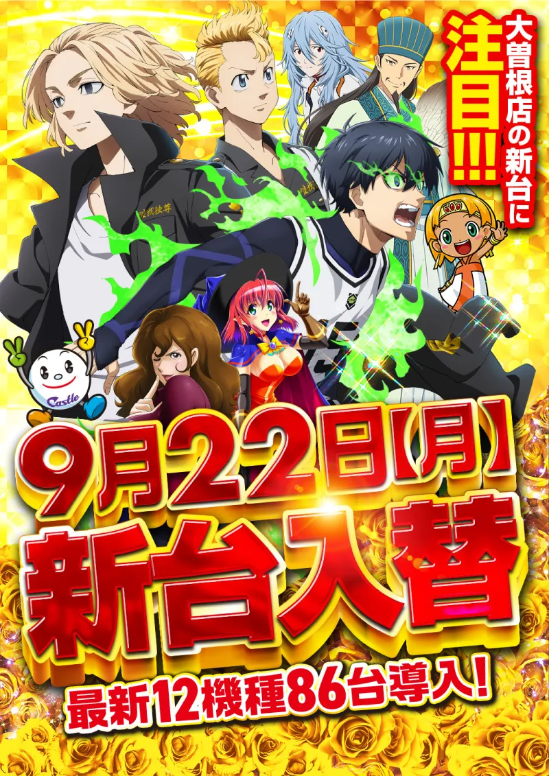 TOP_9/24 18:00 2025 9/24 STORE INTRODUCTION 大曽根店 NEW MACHINE 新台入替のご案内 9月22日(月)朝9時オープン! 一挙導入 SCHEDULE スケジュール キャッスルグループ全店9月27日土曜日朝9時オープン MENU 今月のメニュー 01 新台入替 これが最新導入機種だぁぁぁ! 02 オススメ機種 これが面白い!当店オススメはコレ! 03 機種ラインナップ 選べる楽しさ!設置機種情報はこちら! 04 ランキング&台データ 月間ランキングや当日データをチェック 05 入場方法 入場抽選時間や開店時間をチェック! 06 来店情報 有名人・インフルエンサー来店はこちら 07 厳選賞品・総付景品案内 厳選賞品や無料配布をGET! 08 ポイント景品入荷 ポイ活してゲット! 09 販売会・屋台 嬉しい!楽しい!催し物いっぱい 10 基本情報・アクセス Let′s Go! 11 設備・サービス 快適遊空間! 遊技の後は大曽根温泉湯の城で決まり 各店舗の最新情報やイメージキャラクター吉沢朱音の情報など盛り沢山でおとどけ! MENU メニュー 01 新台入替 02 オススメ機種 03 機種ラインナップ 04 ランキング&台データ 05 入場案内 06 来店情報 07 厳選賞品・総付景品案内 08 ポイント景品入荷 09 販売会・屋台 10 基本情報・アクセス 11 設備・サービス トップ