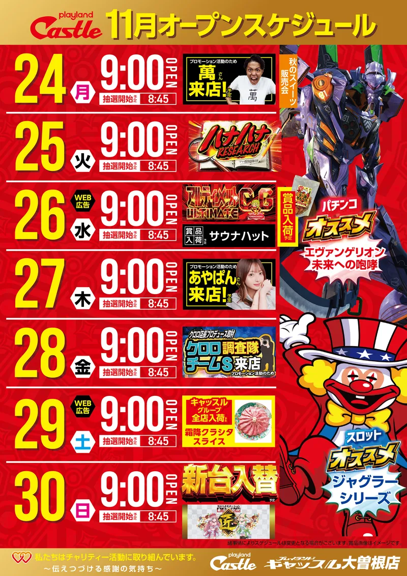 TOP_11/28 18:00 2025 11/28 STORE INTRODUCTION 大曽根店 NEW MACHINE 新台入替のご案内 11月29日(土)朝9時オープン! 9機種16台一挙導入 SCHEDULE スケジュール キャッスルグループ全店11月29日土曜日朝9時オープン MENU 今月のメニュー 01 新台入替 これが最新導入機種だぁぁぁ! 02 オススメ機種 これが面白い!当店オススメはコレ! 03 機種ラインナップ 選べる楽しさ!設置機種情報はこちら! 04 ランキング&台データ 月間ランキングや当日データをチェック 05 入場方法 入場抽選時間や開店時間をチェック! 06 来店情報 有名人・インフルエンサー来店はこちら 07 厳選賞品・総付景品案内 厳選賞品や無料配布をGET! 08 ポイント景品入荷 ポイ活してゲット! 09 販売会・屋台 嬉しい!楽しい!催し物いっぱい 10 基本情報・アクセス Let′s Go! 11 設備・サービス 快適遊空間! 遊技の後は大曽根温泉湯の城で決まり 各店舗の最新情報やイメージキャラクター吉沢朱音の情報など盛り沢山でおとどけ! MENU メニュー 01 新台入替 02 オススメ機種 03 機種ラインナップ 04 ランキング&台データ 05 入場案内 06 来店情報 07 厳選賞品・総付景品案内 08 ポイント景品入荷 09 販売会・屋台 10 基本情報・アクセス 11 設備・サービス トップ