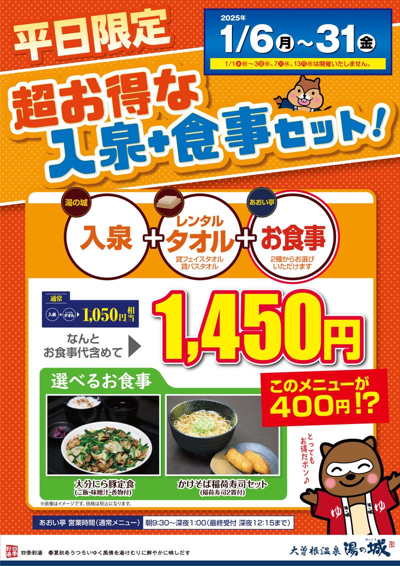 » 2025年1/6(月)~1/31(金)開催! 『平日限定 超お得な入泉+食事セット』