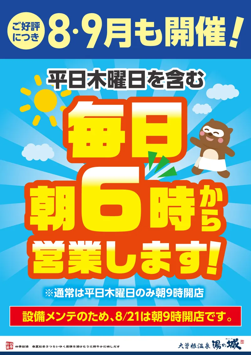 8・9月も開催! 平日木曜日を含む毎日朝6時から営業します!