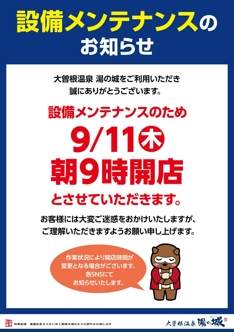 9/11(木) 設備メンテナンスのため朝9時開店とさせていただきます。