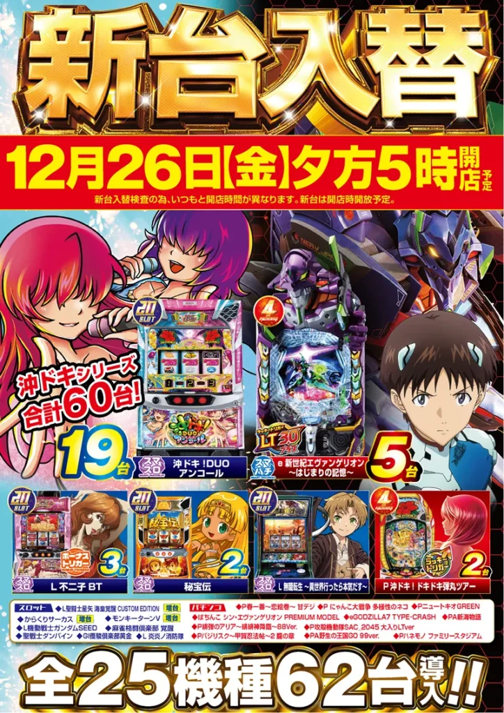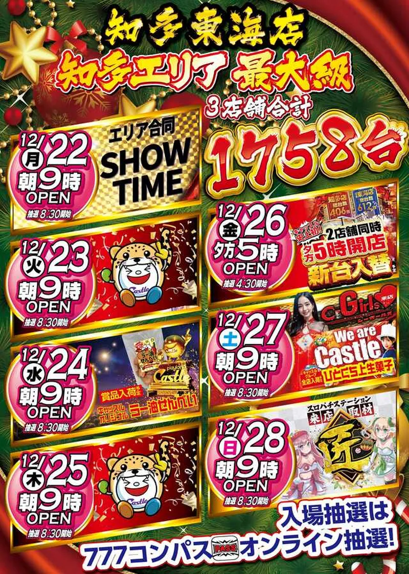 STORE INTRODUCTION 知多東海店 NEW MACHINE 新台入替のご案内 12月26日(金)夕方5時オープン! 25機種63台 一挙導入 SCHEDULE 賞品入荷スケジュール キャッスルグループ全店12月27日土曜日朝9時オープン MENU 今月のメニュー 01 新台入替 これが最新導入機種だぁぁぁ! 02 オススメ機種 これが面白い!当店オススメはコレ! 03 機種ラインナップ 選べる楽しさ!設置機種情報はこちら! 04 ランキング&台データ 月間ランキングや当日データをチェック 05 入場方法 入場抽選時間や開店時間をチェック! 06 来店情報 有名人・インフルエンサー来店はこちら 07 厳選賞品・総付景品案内 厳選賞品や無料配布をGET! 08 屋台 嬉しい!楽しい!催し物いっぱい 09 基本情報・アクセス Let′s Go! 10 設備・サービス 快適遊空間! 各店舗の最新情報やイメージキャラクター吉沢朱音の情報など盛り沢山でおとどけ! MENU メニュー 01 新台入替 02 オススメ機種 03 機種ラインナップ 04 ランキング&台データ 05 入場案内 06 来店情報 07 厳選賞品・総付景品案内 08 屋台 09 基本情報・アクセス 10 設備・サービス