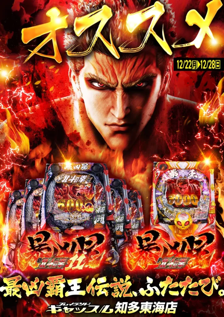 拳王の名にふさわしい出玉性能で乱世を切り開く!! 初当りはすべて獲得出玉が1500個(払い出し)以上で、60%で「拳王RUSH」に突入。 「拳王RUSH」はSTタイプの連チャンゾーンで、10回転+残り保留4個の継続率は約75%。RUSH中の大当りは約50%が出玉3000個(10R×2回・払い出し)、無想転生が発生すれば期待出玉は7500個オーバー!!