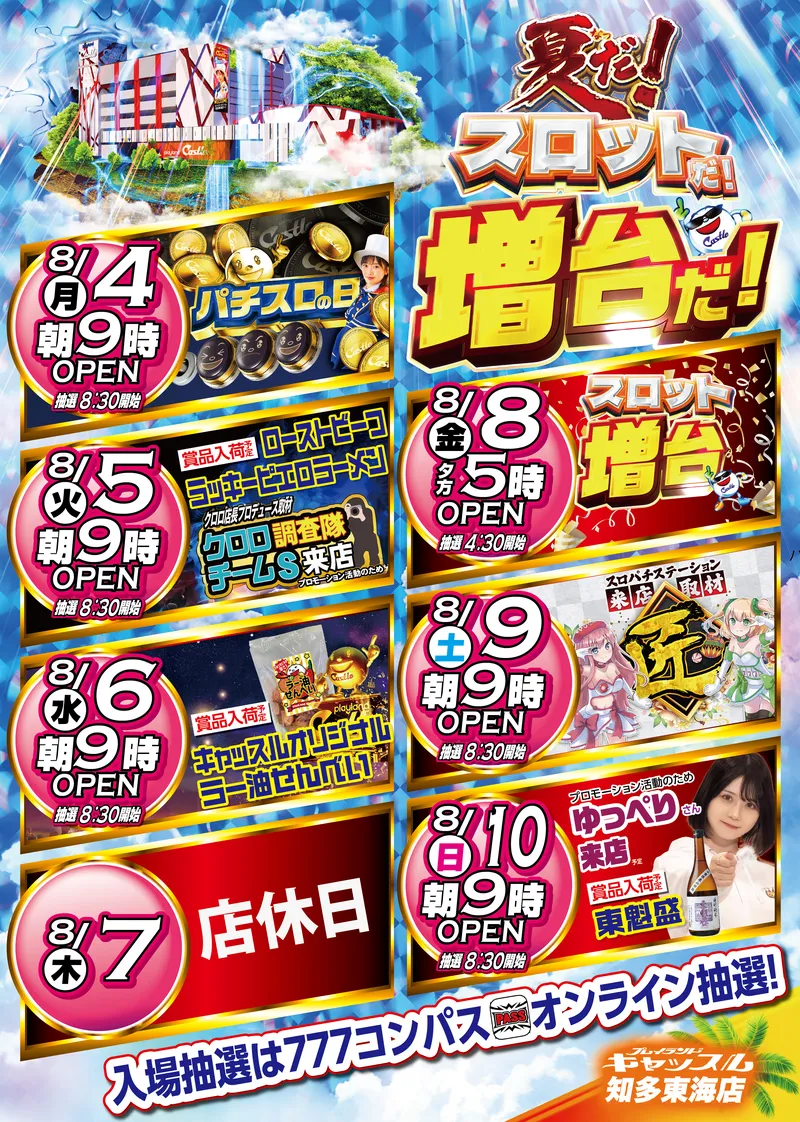 トップ_8/6 18:00 2025 8/06 8月7日(木)店休日 NEW MACHINE 新台入替のご案内 8月8日(金)夕方5時オープン! 35機種82台 一挙導入 SCHEDULE 賞品入荷スケジュール キャッスルグループ全店8月13日水曜日朝9時オープン MENU 今月のメニュー 01 新台入替 これが最新導入機種だぁぁぁ! 02 オススメ機種 これが面白い!当店オススメはコレ! 03 機種ラインナップ 選べる楽しさ!設置機種情報はこちら! 04 ランキング&台データ 月間ランキングや当日データをチェック 05 入場方法 入場抽選時間や開店時間をチェック! 06 来店情報 有名人・インフルエンサー来店はこちら 07 厳選賞品・総付景品案内 厳選賞品や無料配布をGET! 08 屋台 嬉しい!楽しい!催し物いっぱい 09 基本情報・アクセス Let′s Go! 10 設備・サービス 快適遊空間! 各店舗の最新情報やイメージキャラクター吉沢朱音の情報など盛り沢山でおとどけ! MENU メニュー 01 新台入替 02 オススメ機種 03 機種ラインナップ 04 ランキング&台データ 05 入場案内 06 来店情報 07 厳選賞品・総付景品案内 08 屋台 09 基本情報・アクセス 10 設備・サービス トップ