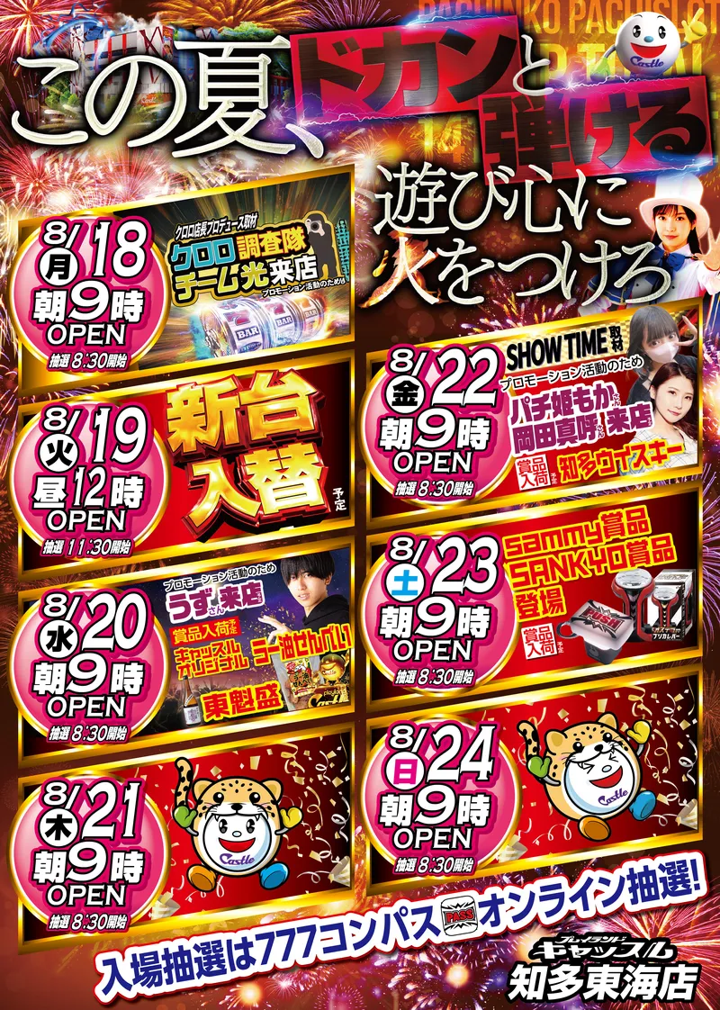 トップ_8/17 18:00 2025 8/17 NEW MACHINE 新台入替のご案内 8月19日(火)昼12時オープン! 17機種33台 一挙導入 SCHEDULE 賞品入荷スケジュール キャッスルグループ全店8月20日水曜日朝9時オープン MENU 今月のメニュー 01 新台入替 これが最新導入機種だぁぁぁ! 02 オススメ機種 これが面白い!当店オススメはコレ! 03 機種ラインナップ 選べる楽しさ!設置機種情報はこちら! 04 ランキング&台データ 月間ランキングや当日データをチェック 05 入場方法 入場抽選時間や開店時間をチェック! 06 来店情報 有名人・インフルエンサー来店はこちら 07 厳選賞品・総付景品案内 厳選賞品や無料配布をGET! 08 屋台 嬉しい!楽しい!催し物いっぱい 09 基本情報・アクセス Let′s Go! 10 設備・サービス 快適遊空間! 各店舗の最新情報やイメージキャラクター吉沢朱音の情報など盛り沢山でおとどけ! MENU メニュー 01 新台入替 02 オススメ機種 03 機種ラインナップ 04 ランキング&台データ 05 入場案内 06 来店情報 07 厳選賞品・総付景品案内 08 屋台 09 基本情報・アクセス 10 設備・サービス トップ