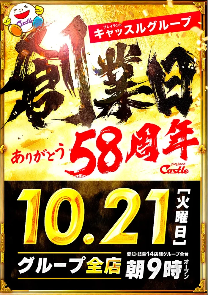 トップ_10/18 18:00 2025 10/18 STORE INTRODUCTION 知多東海店 NEW MACHINE 新台入替のご案内 10月7日(火)昼12時オープン! 23機種58台 一挙導入 SCHEDULE 賞品入荷スケジュール キャッスルグループ全店10月22日水曜日朝9時オープン MENU 今月のメニュー 01 新台入替 これが最新導入機種だぁぁぁ! 02 オススメ機種 これが面白い!当店オススメはコレ! 03 機種ラインナップ 選べる楽しさ!設置機種情報はこちら! 04 ランキング&台データ 月間ランキングや当日データをチェック 05 入場方法 入場抽選時間や開店時間をチェック! 06 来店情報 有名人・インフルエンサー来店はこちら 07 厳選賞品・総付景品案内 厳選賞品や無料配布をGET! 08 屋台 嬉しい!楽しい!催し物いっぱい 09 基本情報・アクセス Let′s Go! 10 設備・サービス 快適遊空間! 各店舗の最新情報やイメージキャラクター吉沢朱音の情報など盛り沢山でおとどけ! MENU メニュー 01 新台入替 02 オススメ機種 03 機種ラインナップ 04 ランキング&台データ 05 入場案内 06 来店情報 07 厳選賞品・総付景品案内 08 屋台 09 基本情報・アクセス 10 設備・サービス トップ