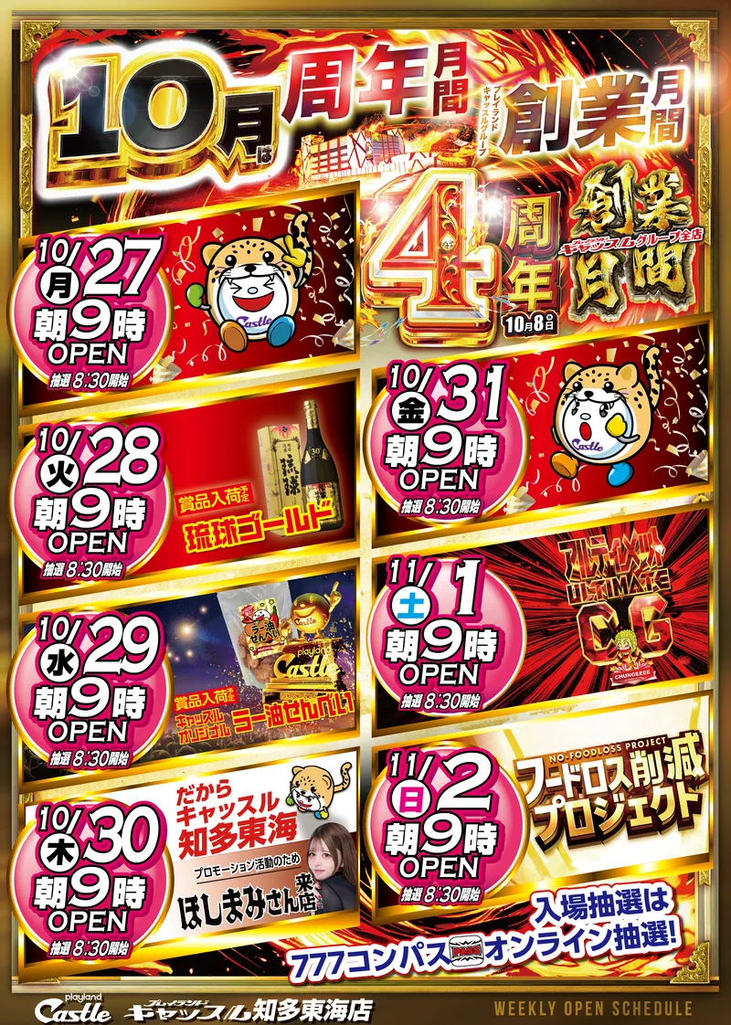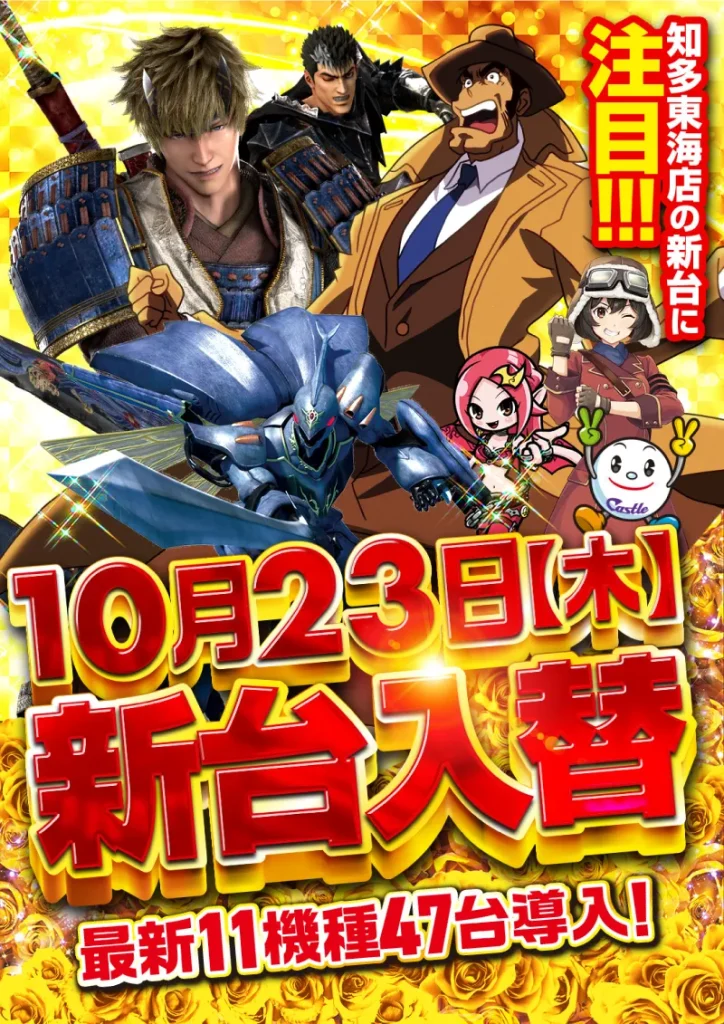 トップ_10/30 18:00 2025 10/30 STORE INTRODUCTION 知多東海店 NEW MACHINE 新台入替のご案内 10月23日(木)昼12時オープン! 19機種37台 一挙導入 SCHEDULE 賞品入荷スケジュール キャッスルグループ全店11月5日水曜日朝9時オープン MENU 今月のメニュー 01 新台入替 これが最新導入機種だぁぁぁ! 02 オススメ機種 これが面白い!当店オススメはコレ! 03 機種ラインナップ 選べる楽しさ!設置機種情報はこちら! 04 ランキング&台データ 月間ランキングや当日データをチェック 05 入場方法 入場抽選時間や開店時間をチェック! 06 来店情報 有名人・インフルエンサー来店はこちら 07 厳選賞品・総付景品案内 厳選賞品や無料配布をGET! 08 屋台 嬉しい!楽しい!催し物いっぱい 09 基本情報・アクセス Let′s Go! 10 設備・サービス 快適遊空間! 各店舗の最新情報やイメージキャラクター吉沢朱音の情報など盛り沢山でおとどけ! MENU メニュー 01 新台入替 02 オススメ機種 03 機種ラインナップ 04 ランキング&台データ 05 入場案内 06 来店情報 07 厳選賞品・総付景品案内 08 屋台 09 基本情報・アクセス 10 設備・サービス トップ
