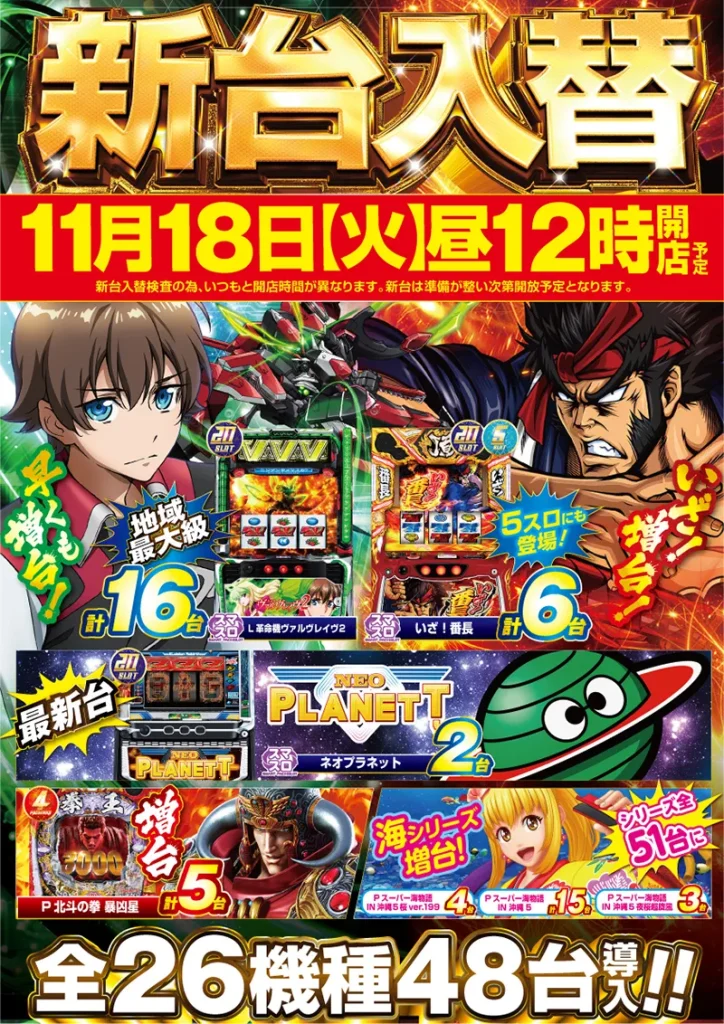 トップ_11/16 18:00 2025 11/16 STORE INTRODUCTION 知多東海店 NEW MACHINE 新台入替のご案内 11月18日(火)昼12時オープン! 26機種48台 一挙導入 SCHEDULE 賞品入荷スケジュール キャッスルグループ全店11月19日水曜日朝9時オープン MENU 今月のメニュー 01 新台入替 これが最新導入機種だぁぁぁ! 02 オススメ機種 これが面白い!当店オススメはコレ! 03 機種ラインナップ 選べる楽しさ!設置機種情報はこちら! 04 ランキング&台データ 月間ランキングや当日データをチェック 05 入場方法 入場抽選時間や開店時間をチェック! 06 来店情報 有名人・インフルエンサー来店はこちら 07 厳選賞品・総付景品案内 厳選賞品や無料配布をGET! 08 屋台 嬉しい!楽しい!催し物いっぱい 09 基本情報・アクセス Let′s Go! 10 設備・サービス 快適遊空間! 各店舗の最新情報やイメージキャラクター吉沢朱音の情報など盛り沢山でおとどけ! MENU メニュー 01 新台入替 02 オススメ機種 03 機種ラインナップ 04 ランキング&台データ 05 入場案内 06 来店情報 07 厳選賞品・総付景品案内 08 屋台 09 基本情報・アクセス 10 設備・サービス トップ