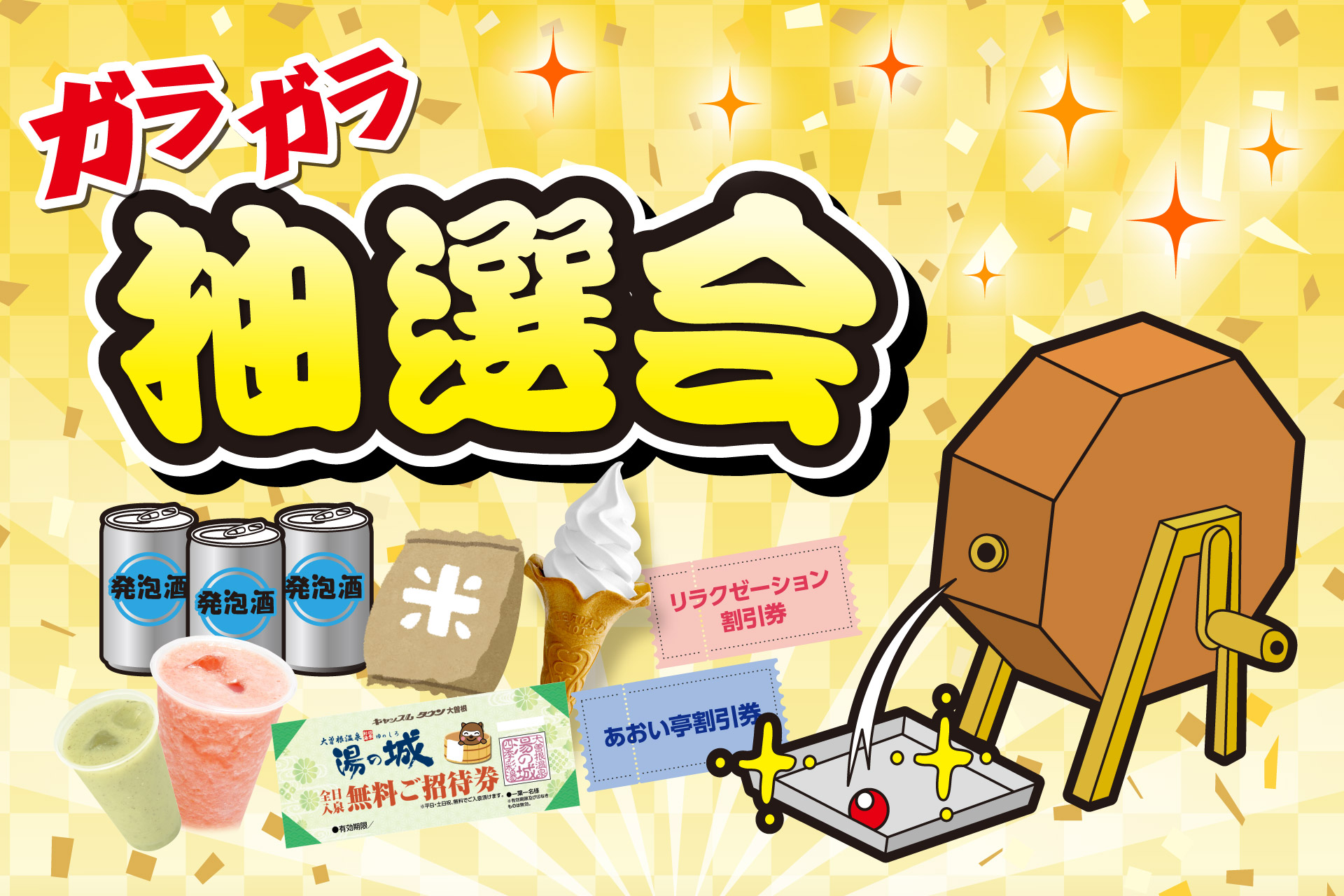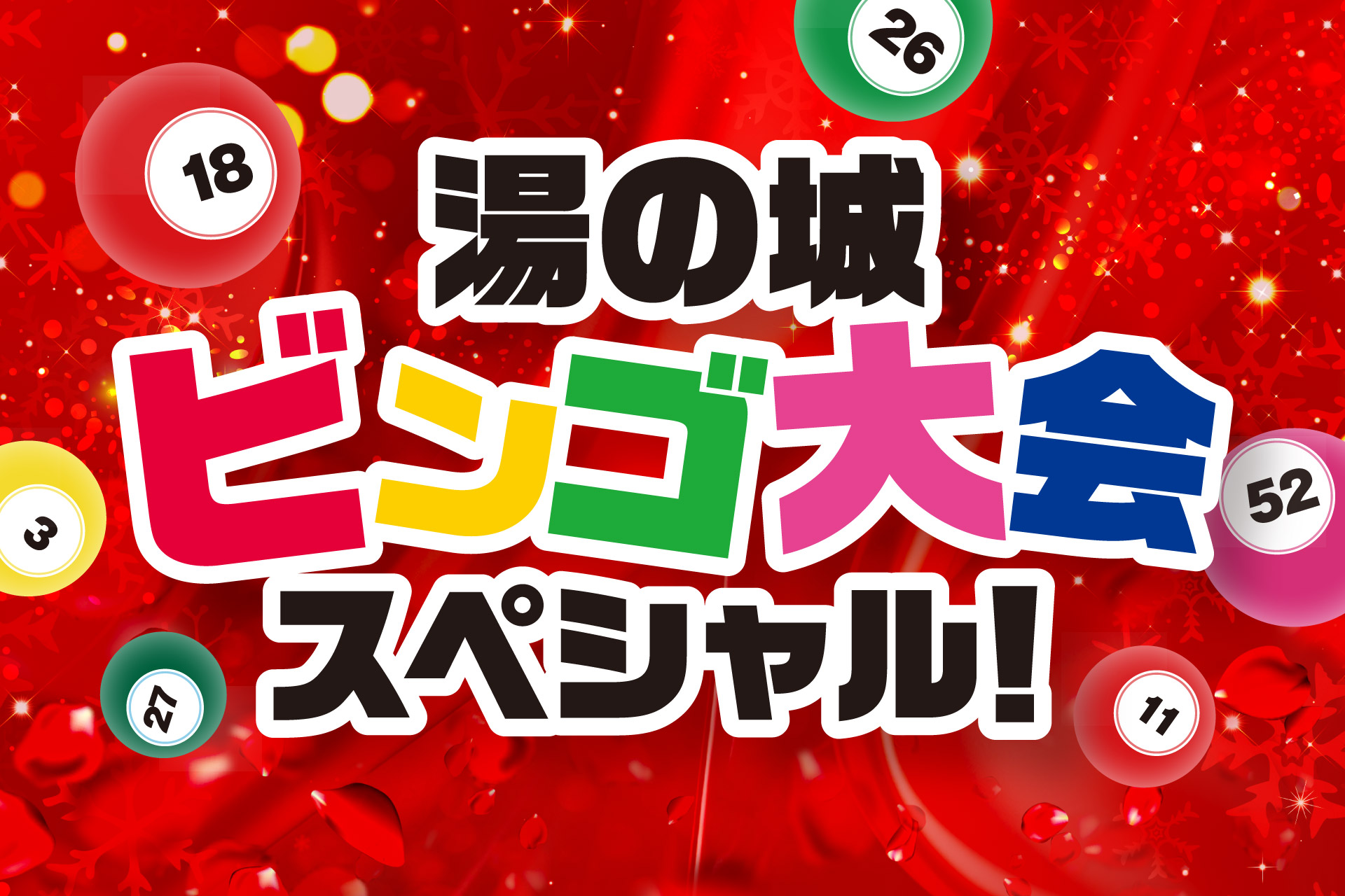 豪華景品が当たる、大人気のビンゴ大会をスペシャル開催します。湯の城の無料ご招待券ビールお米など、豪華な賞品が当たるチャンスです。
