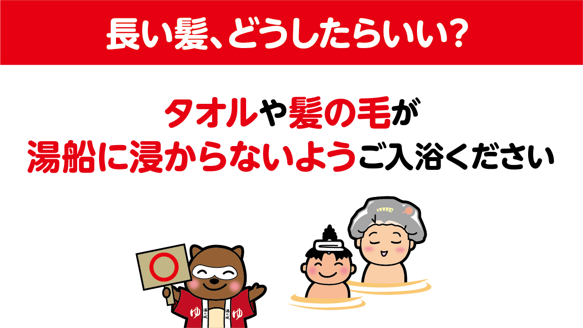 髪が湯船に入らないように、ゴムやヘアキャップでまとめましょう。他のお客様も気持ちよく入浴できます。