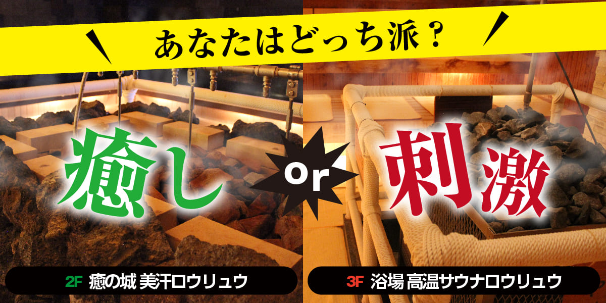 湯の城では、そんなロウリュウを「癒しの”美汗ロウリュウ”」と「本格派の”高温サウナロウリュウ”」の2種類でお楽しみいただけます。気分や目的に合わせてお楽しみください。