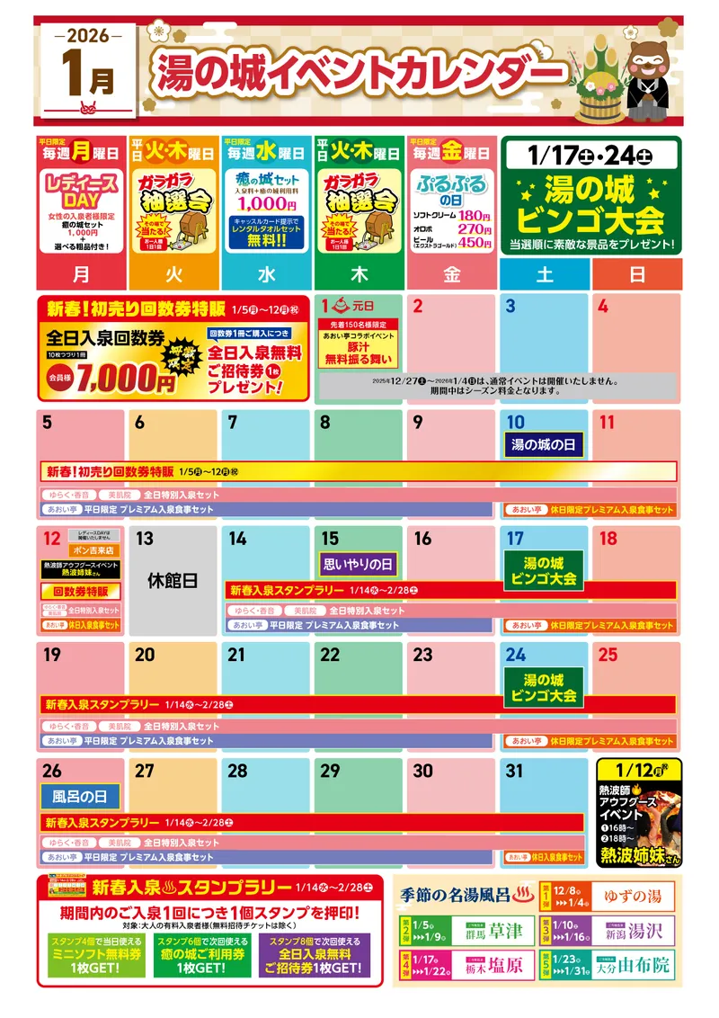 お知らせ Slide 2026.1.1 2026謹賀新年 本年もどうぞよろしくお願いいします。 2025.12.12 年末年始営業のご案内 2025.11.26 11/26(水)テレビ放送されました。 もっと見る イベントカレンダー 26b845b240fe3264bb280ba60591e7cb8049debf090b1e11a35cd7a12fcd7466-400x20012db2049f335f4c62ac2842fcf733b39-768x384-1-400x200 湯の城トピックス 営業案内 初めての方へ お風呂 岩盤浴 サウナ 食事処 ぷるぷる情報 ポン吉くん 店舗情報 メディア実績 リラクゼーション その他 その他 2025.12.26 【フォロー&コメントで参加】ととのいタオルが当たる年末年始プレゼントキャンペーン|家族で応募しよう! ぷるぷる情報 2025.12.26 『ぷるぷる』今年の売上TOP3発表!お客様に愛される人気メニューはこれだ! お食事処 2025.12.26 『あおい亭』今年の売上TOP3発表!お客様が選んだ絶品メニューはこれだ! お食事処 2025.12.10 【期間限定】大垣の冬は心も体も温まる!冬のおすすめメニューで至福のひととき お食事処 2025.12.10 【期間限定開催】一年の幸福を願って…大垣で味わう縁起物『年明け麺フェア』 その他 2025.12.3 湯の城グループで巡る極上温泉♨姉妹店それぞれの魅力を徹底紹介 もっと見る ブログ 全て おすすめ お知らせ お知らせブログ重要なお知らせ 詳細はこちら> おすすめブログ 詳細はこちら> お知らせブログ 詳細はこちら> お知らせブログ 詳細はこちら> おすすめブログ 詳細はこちら> おすすめブログ 2023.03.27 漫画でわかるととのい作法【ととのい方編】 詳細はこちら> おすすめブログ 2023.02.27 漫画でわかるととのい作法【サウナ入る前編】 詳細はこちら> おすすめブログ 2023.05.15 漫画でわかるととのい作法【サウナ出た後編】 詳細はこちら> おすすめブログ 2023.02.21 とってもお得!『新規会員様募集!』 詳細はこちら> おすすめブログ 2023.02.21 平日朝『手ぶらで朝風呂』 詳細はこちら> お知らせブログ重要なお知らせ 2023.12.21 大垣天然温泉湯の城がニフティ温泉 年間ランキング 2023にて岐阜県総合ランキング:4位を受賞いたしました。 詳細はこちら> お知らせブログ 2023.02.28 岐阜最アツサウナが湯の城にあり!? 詳細はこちら> お知らせブログ 2023.02.28 大垣湯の城のナノ天然温泉って? 詳細はこちら> もっと見る お知らせ 閉じる お知らせ 閉じる