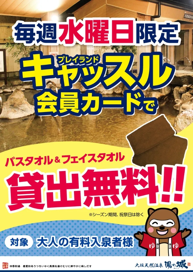 キャッスルカード提示でタオルが無料に。手ぶらで気軽に来館できる嬉しいサービス。