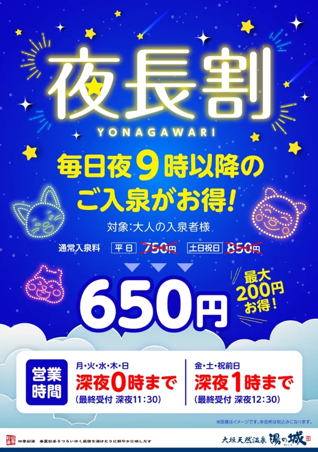 平日夜の時間帯にお得な入泉割引を実施。仕事帰りのリフレッシュにぴったり!