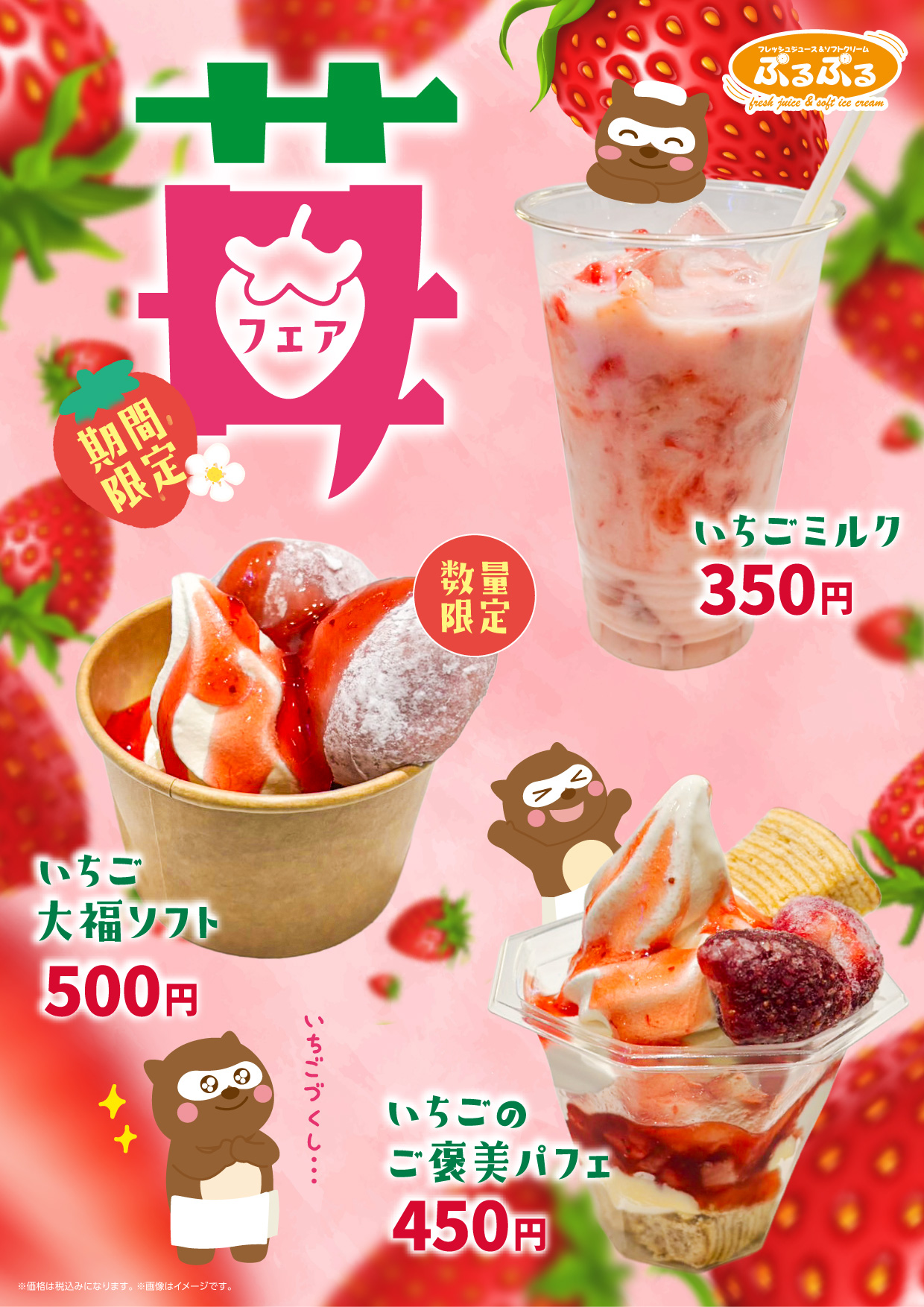 12月のぷるぷるでは、冬の人気フルーツ「苺」を使った新メニューフェアを開催します。真っ赤な苺をたっぷり使用したパフェやスイーツは、見た目も華やかで、温泉上がりの体を優しく冷やしてくれます。