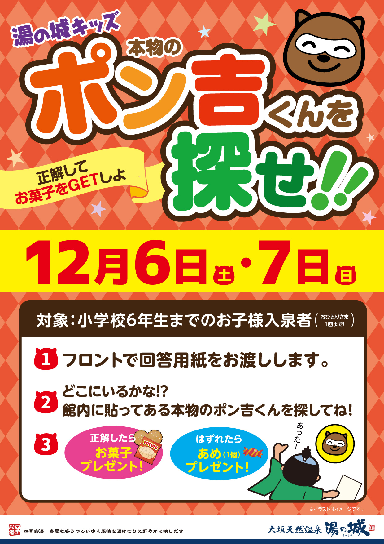 12月最初の週末は、子供たちに大人気の「ポン吉くんを探せ!」イベントを開催します。湯の城のマスコットキャラクター・ポン吉くんが館内のどこかに隠れているので、それを探し出すというワクワクする企画です。小学6年生までのお子様が対象で、正解したら素敵なお菓子をプレゼントいたします。