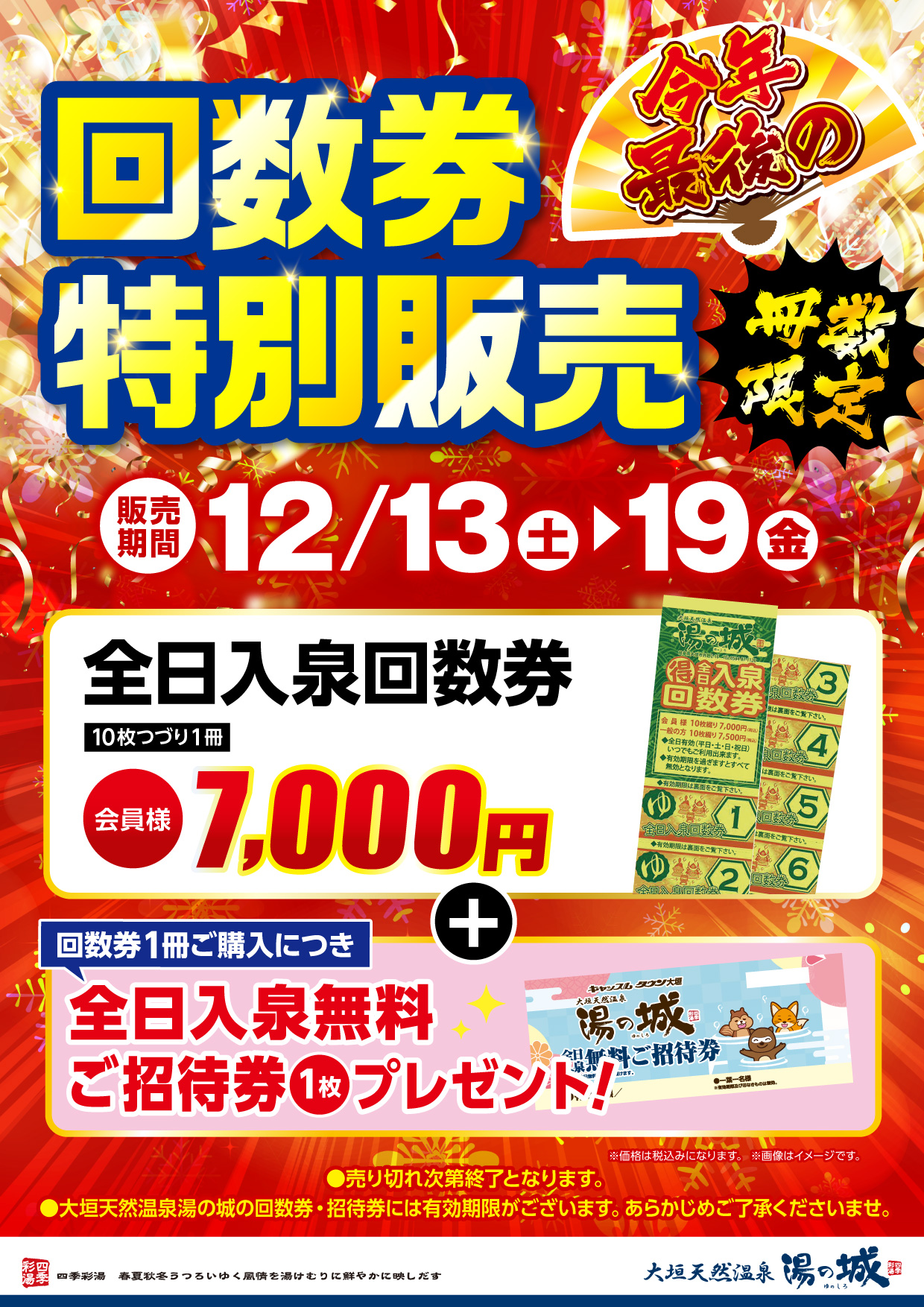 12月13日から19日までの1週間限定で、2025年最後の回数券特販を実施いたします。通常7,000円の全日入泉回数券が特別価格で購入できるこの機会は、定期的に湯の城をご利用いただいているお客様には見逃せないチャンスです。