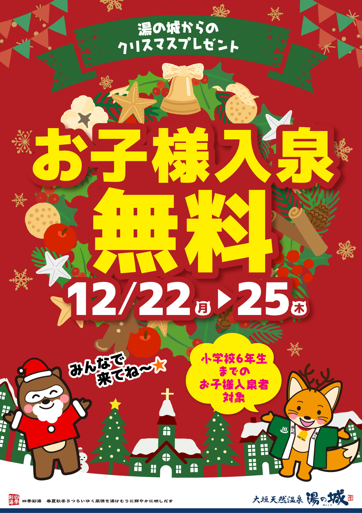 クリスマス期間中の12月22日から25日まで、小学6年生までのお子様の入泉料が無料になります。温泉施設からの特別なクリスマスプレゼントとして、ご家族皆様で湯の城をお楽しみいただけるチャンスです。