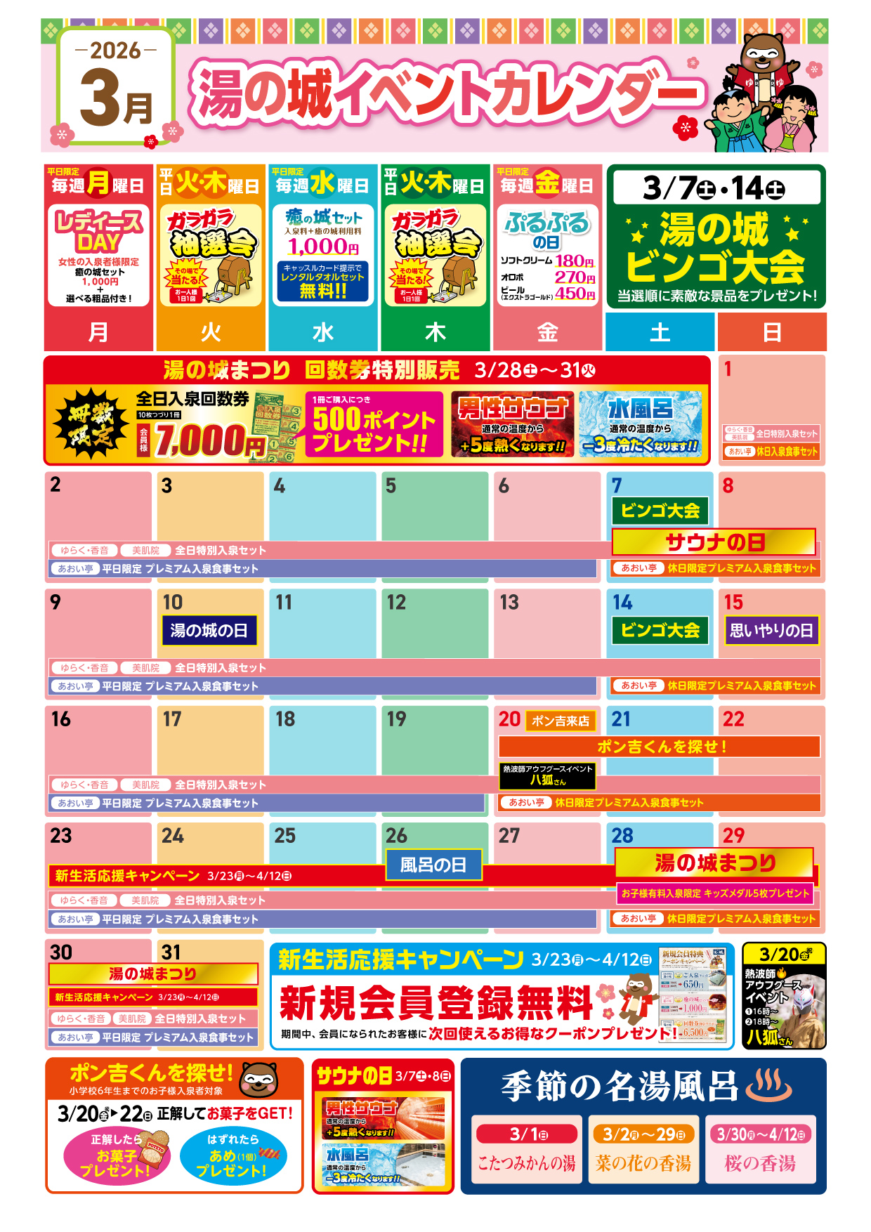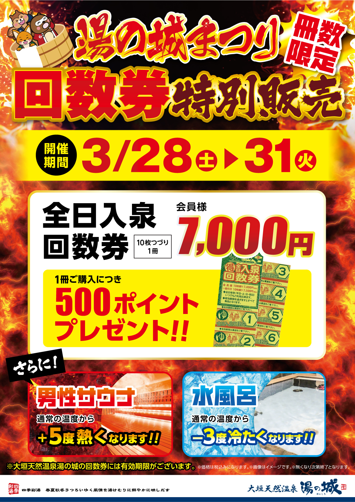 • 3/28(土)~31(火)湯の城まつり(回数券特販、+5℃/△3℃設定)