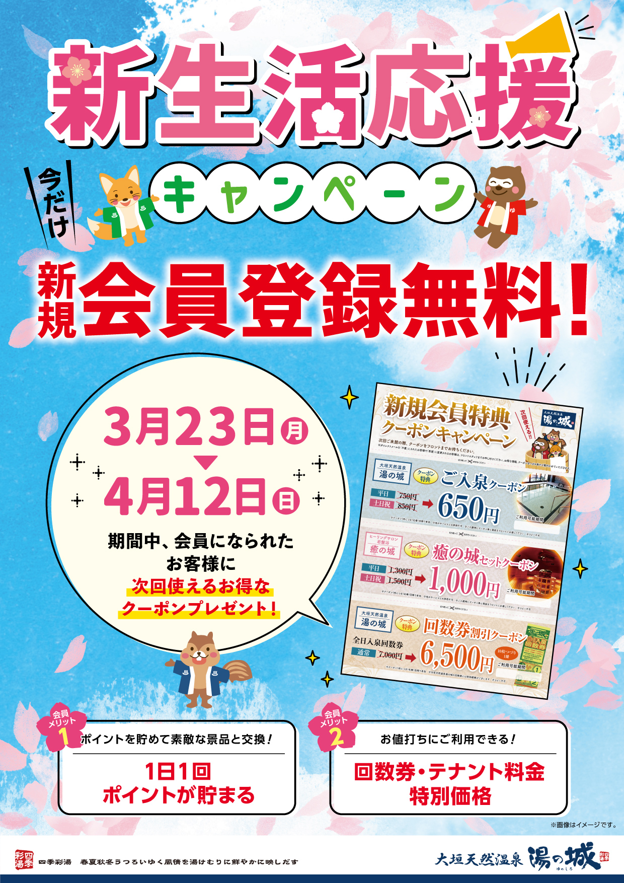 • 3/23(月)~4/3(金) 新規会員登録無料&優待クーポン配布