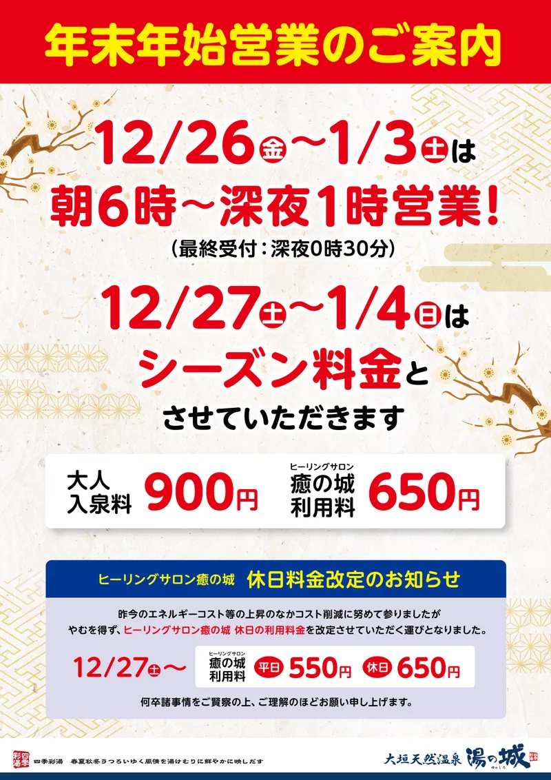 2024年12/28(土)~2025年1/5(日)休日料金