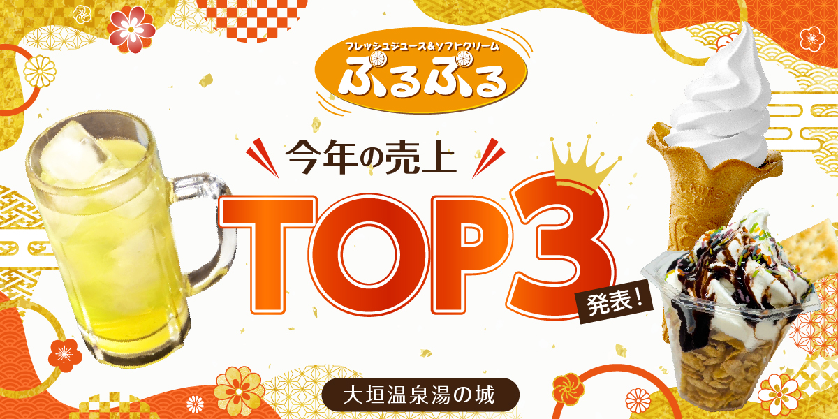 大垣天然温泉湯の城「ぷるぷる」の今年の売上TOP3は、 1位:ソフトクリーム バニラ-温泉上がりの定番 2位:オロポ-サウナ―注目のリカバリードリンク 3位:チョコサンデー-濃厚な甘さで至福の贅沢